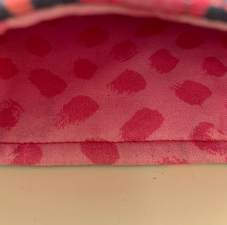 The sleeve is quilted with blue colour stitching and is fully lined with pink patterned cotton fabric.