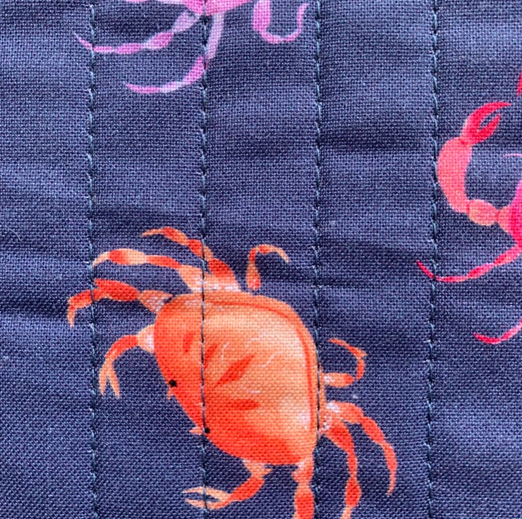 It is made in this colourful cotton fabric featuring crabs on a mid blue colour background.