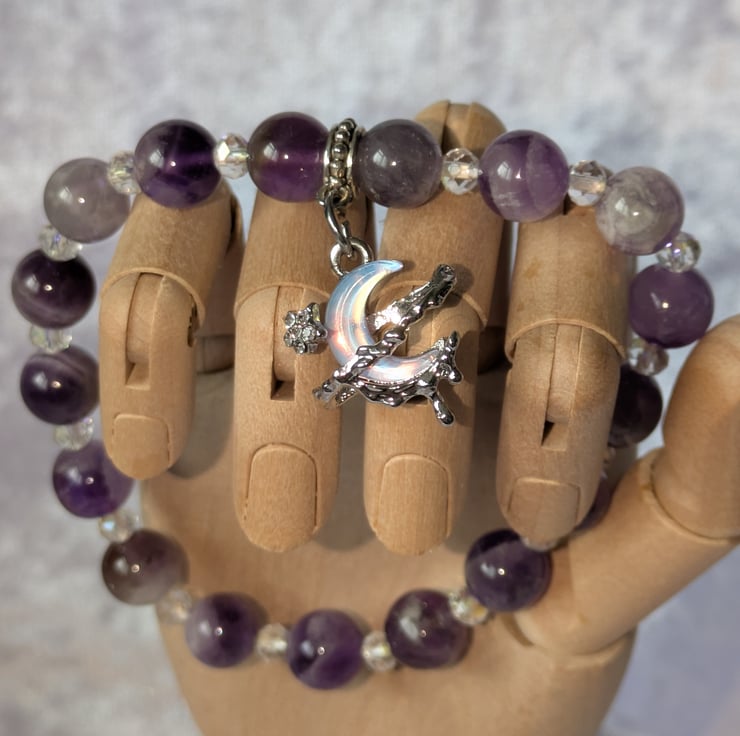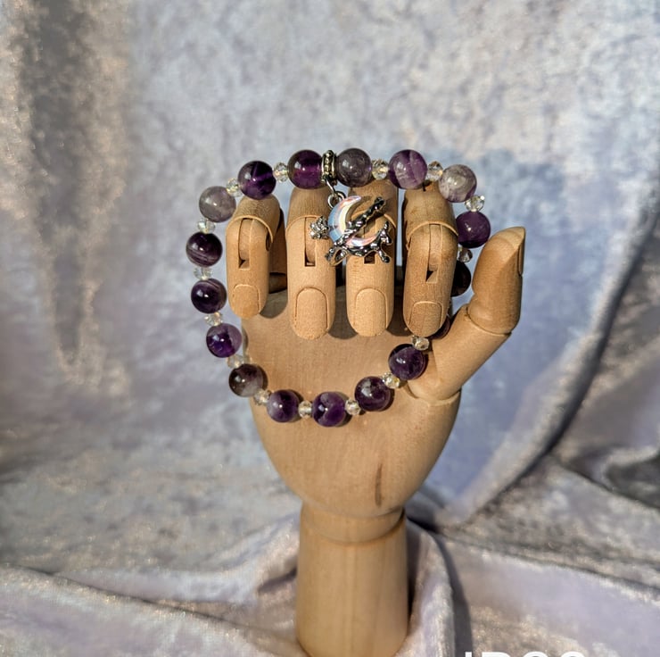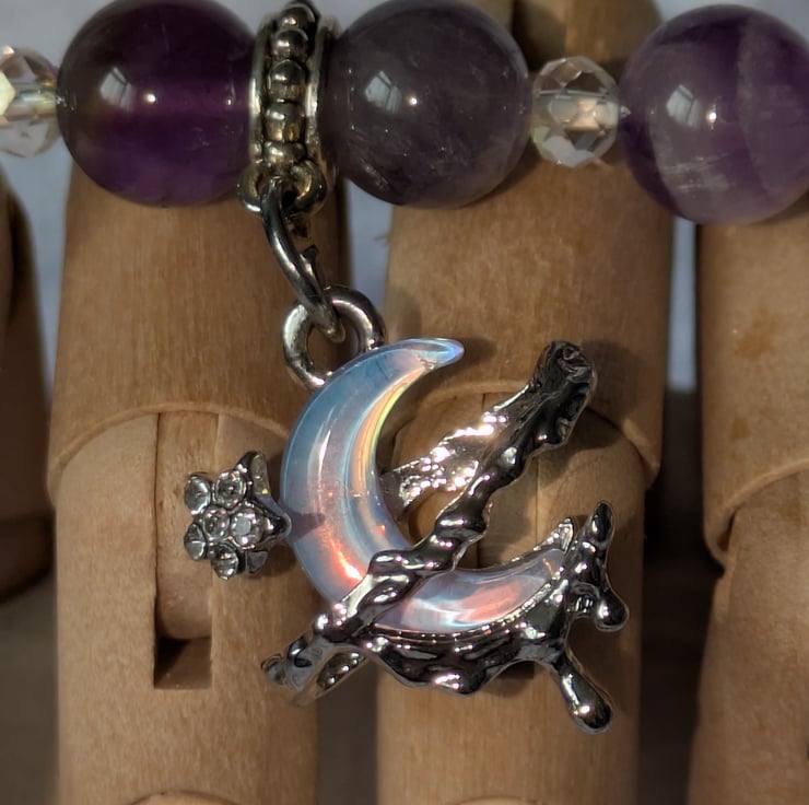 Gorgeous tomes of purple and white create these beautiful dream amethyst crystal beads. In between each crystal bead is a small faceted clear bead. There is a silver coloured charm disc with a dreamy aura crescent moon surrounded with a silver coloured shooting star with clear rhinestones. Amethyst is a calming crystal believed to promote spiritual growth.