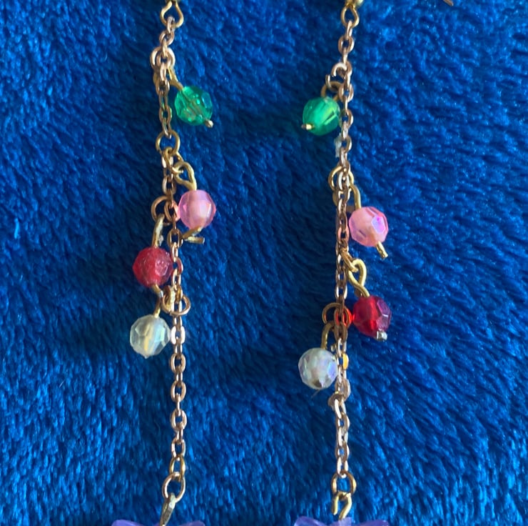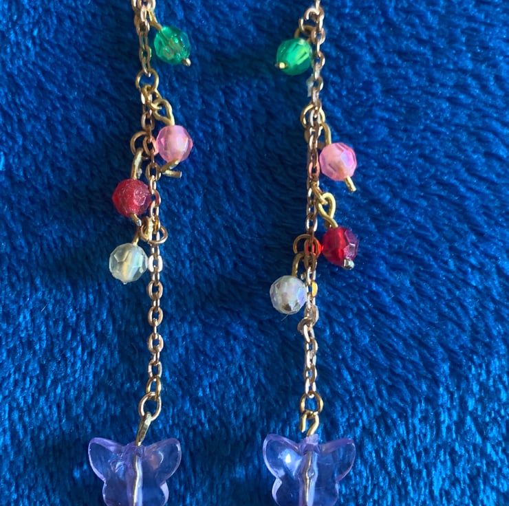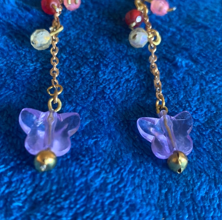 Delicate drop earrings with multi colour beads and butterfly detail. On shepherd hooks