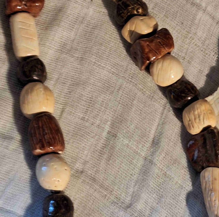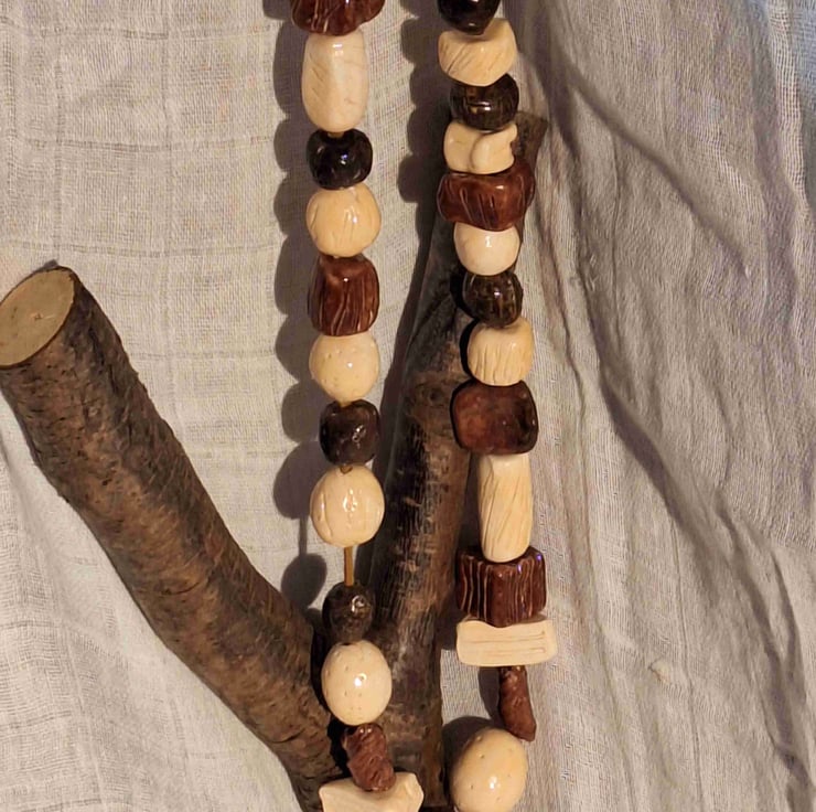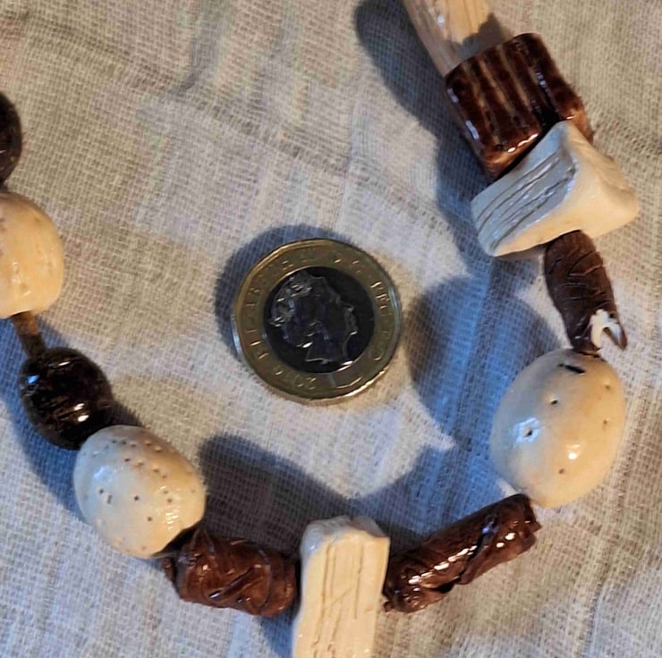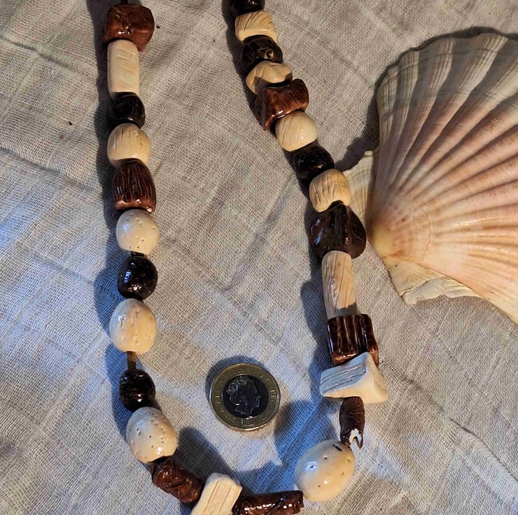 This handcrafted statement necklace cones in a stylish design that compliments a variety of outfits. Each bead has been lovingly crafted to be unique with square, triangle, and round shapes. And will be a popular choice for any jewellery lover.