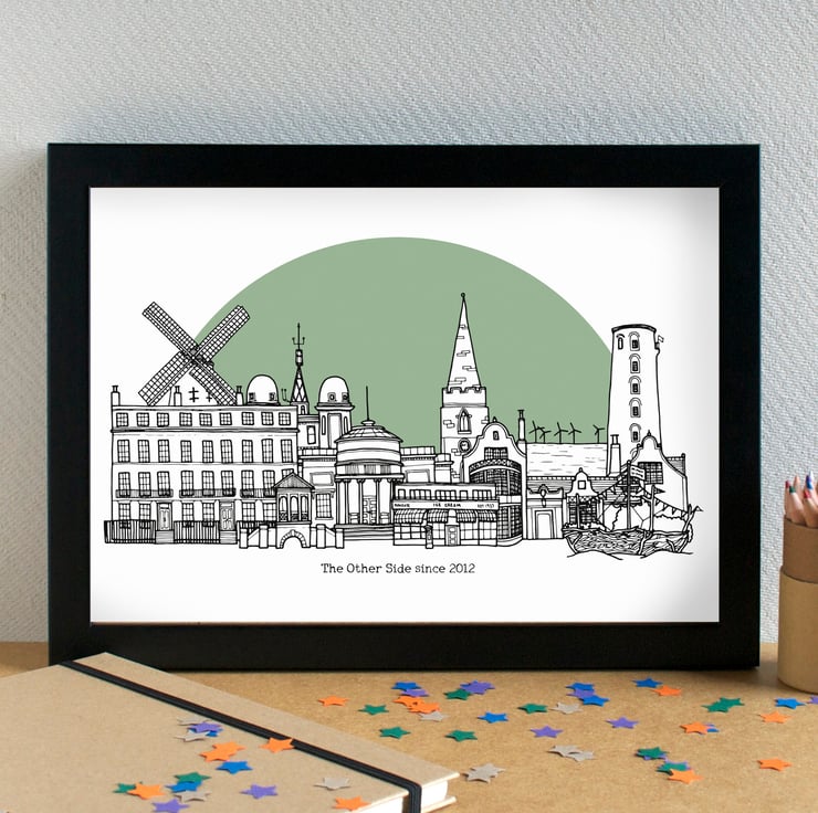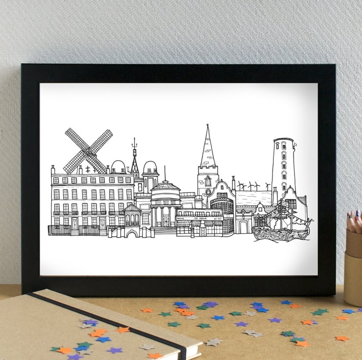 A stunning print of my skyline illustration of the most famous landmarks on the Wirral.