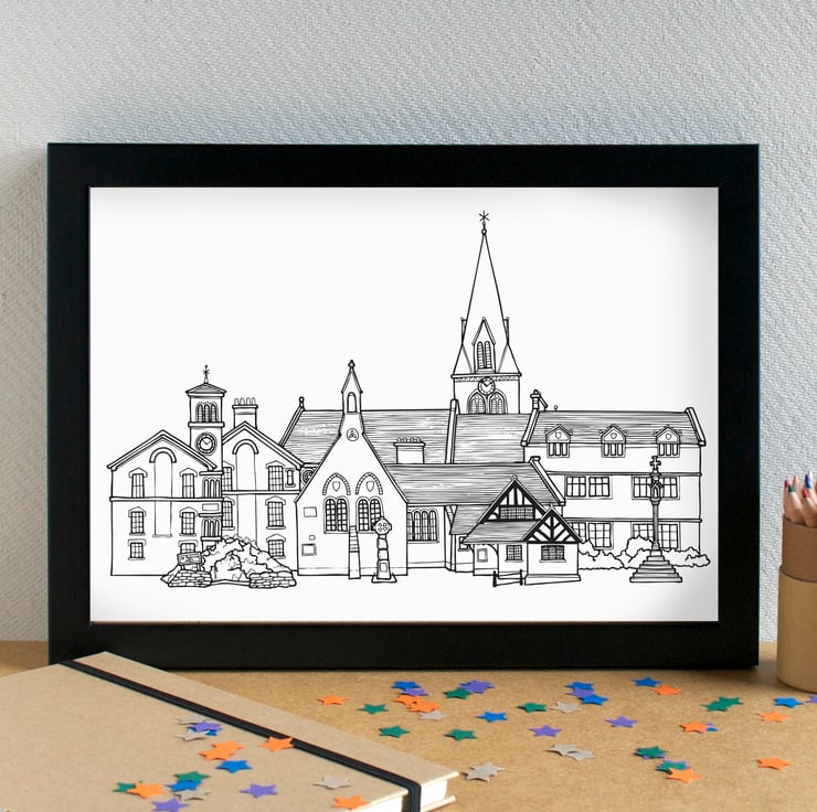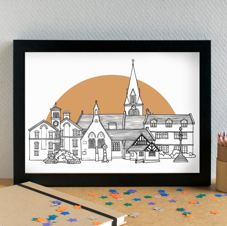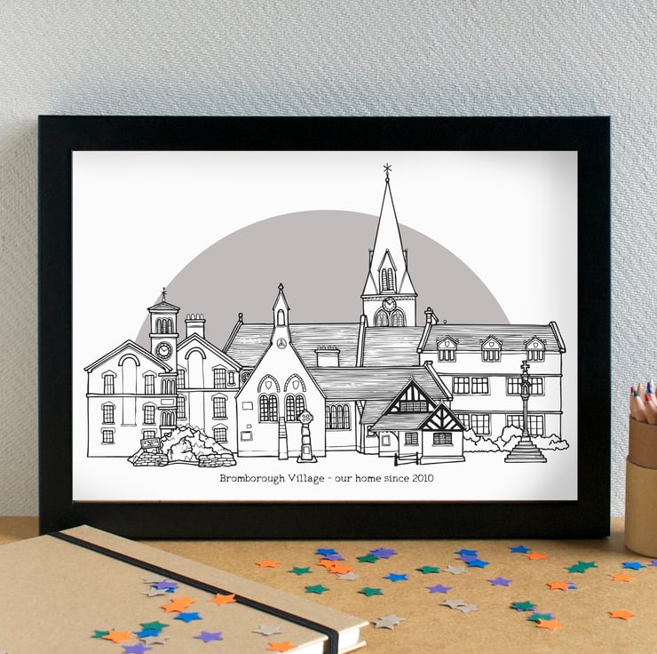 A pretty print of my skyline illustration of the most famous landmarks in the Wirral's Bromborough.