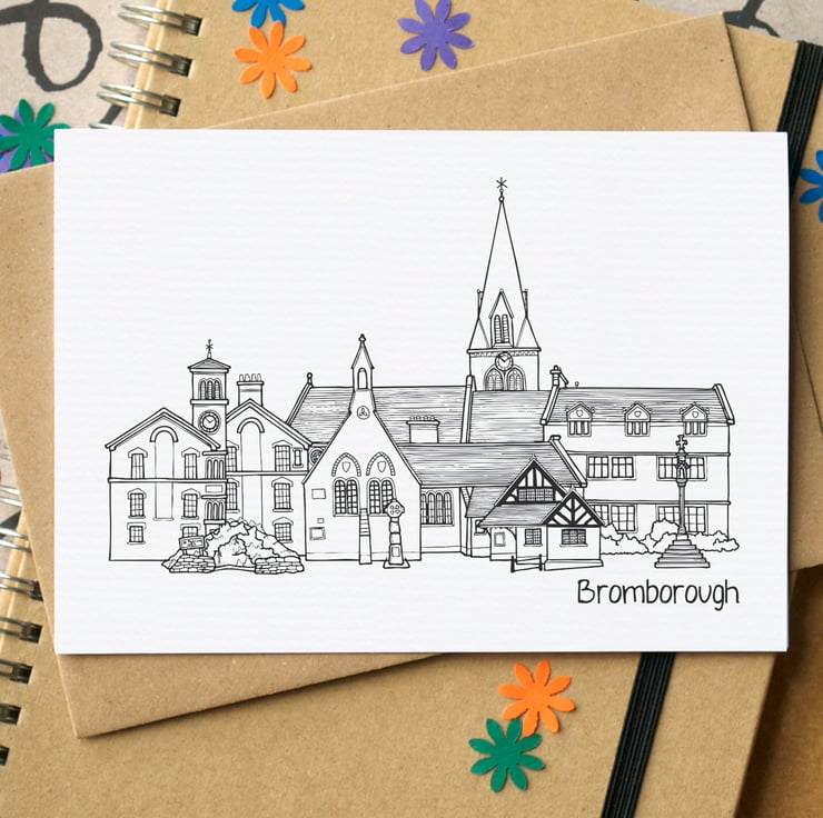 A blank card featuring a skyline illustration of some of Bromborough's greatest landmarks.