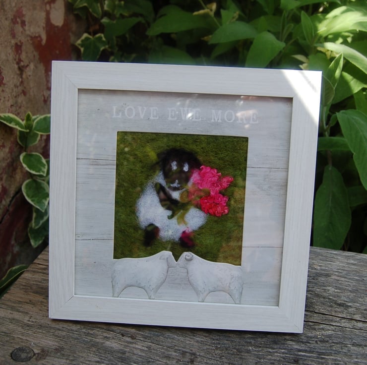 Framed Textile art picture - Love Ewe More 18 x 18 cm Needle felt