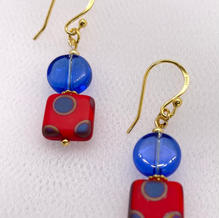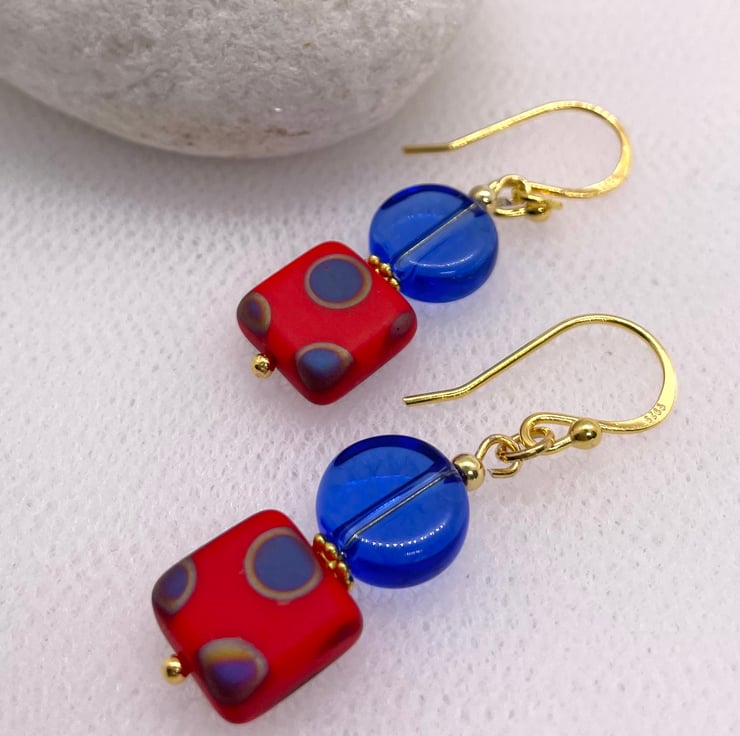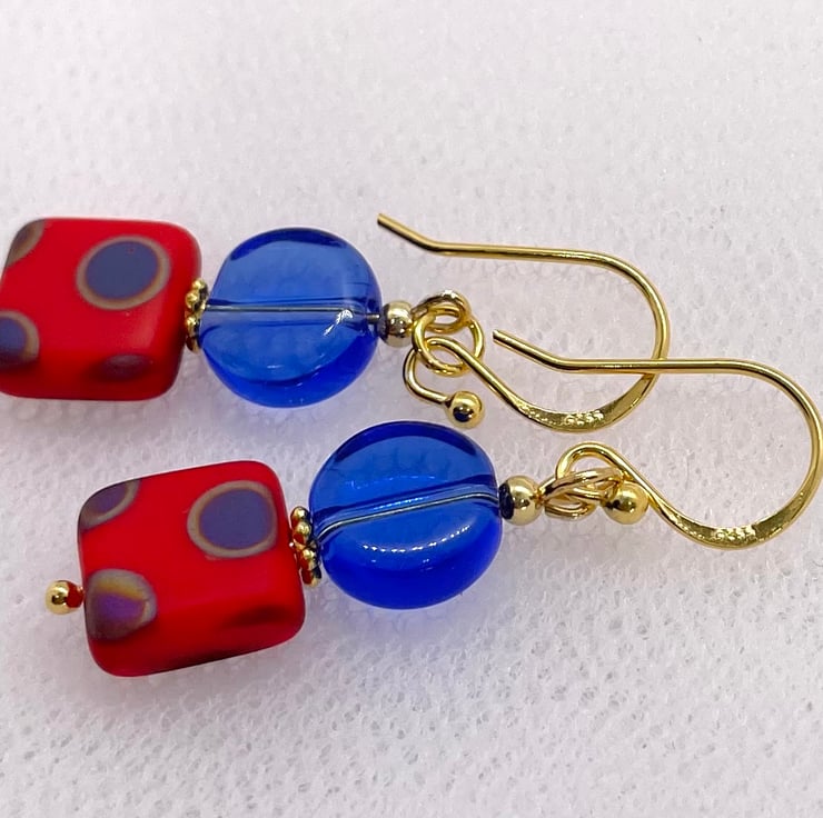 Bright and colourful Czech Glass beaded earrings with Poppy Red Peacock beads and Czech glass royal blue Czech glass flat bead combined with gold vermeil earring hooks wires and components.