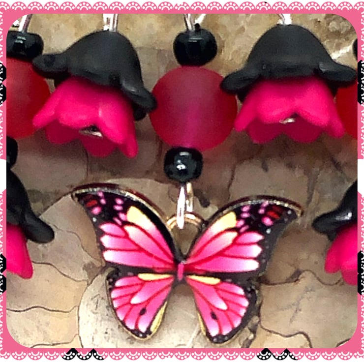 Using this 5 cm silver plated kilt pin blank I’ve added hot pink frosted glass beads, black seed beads with Lucite flowers & this lovely enamelled red & black butterfly charm