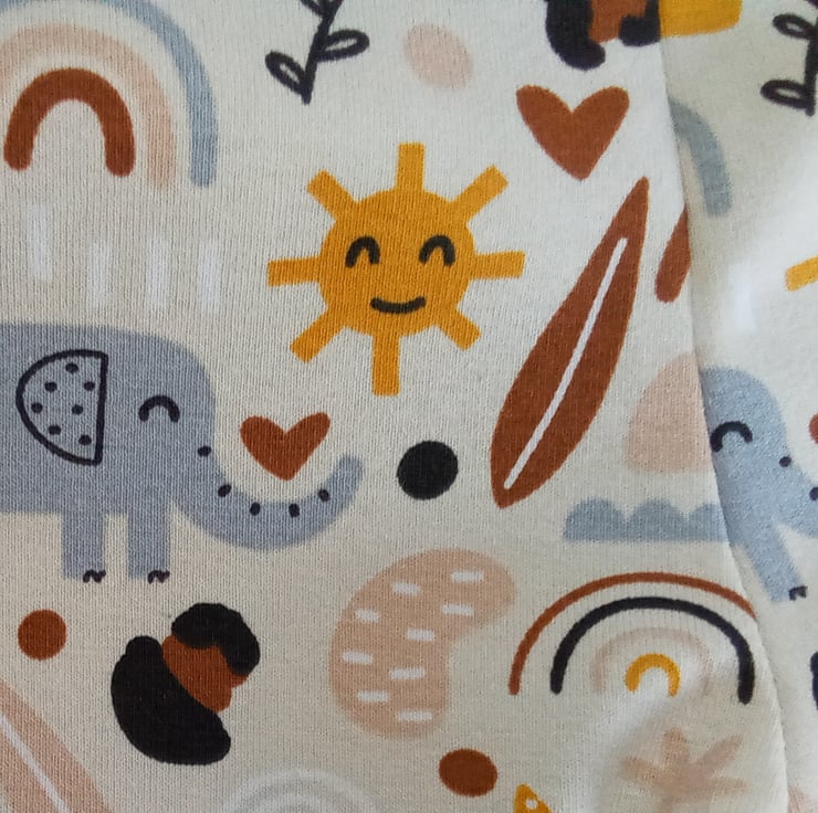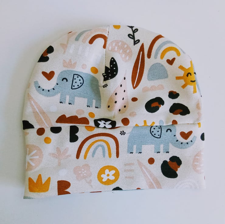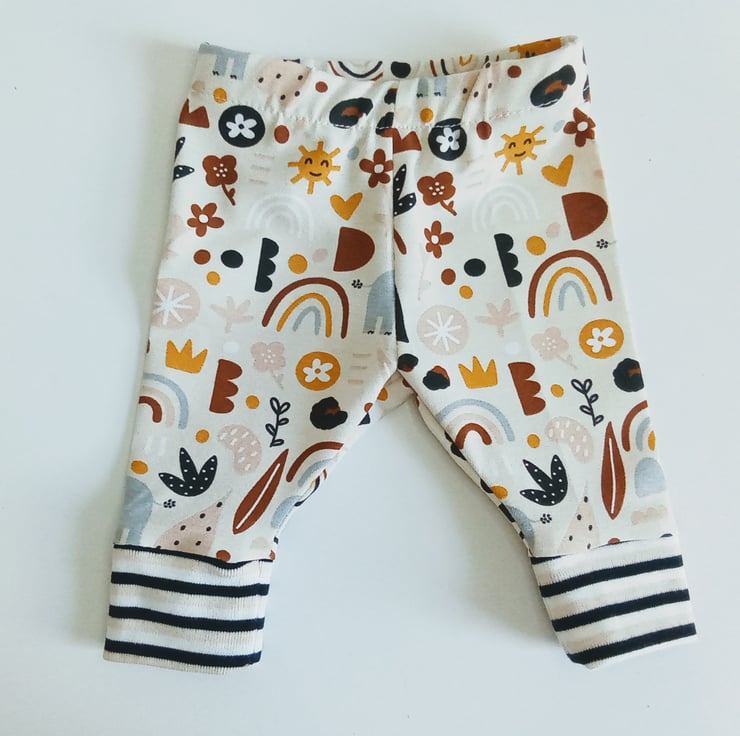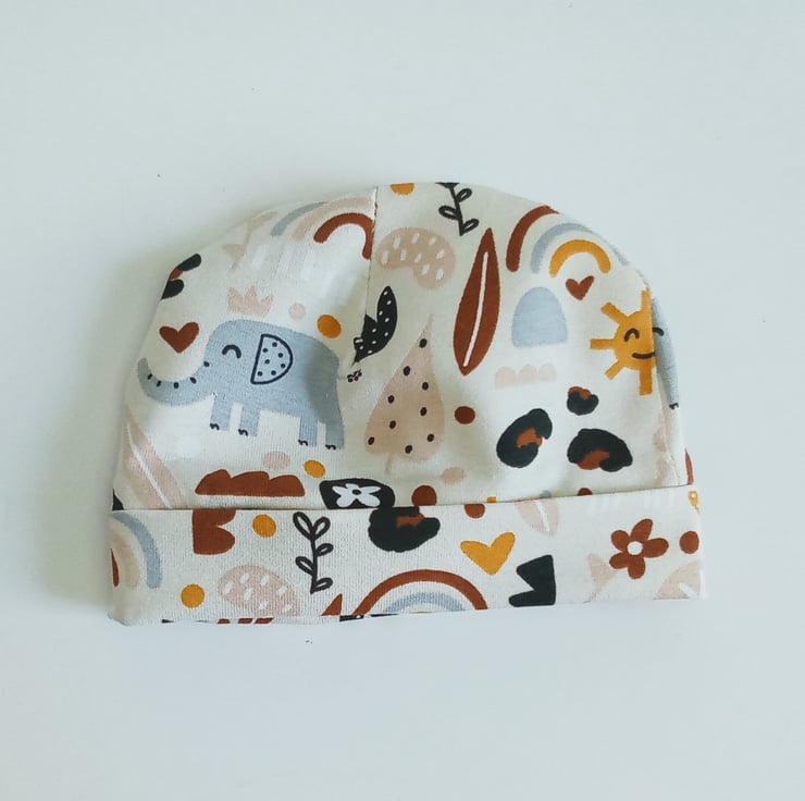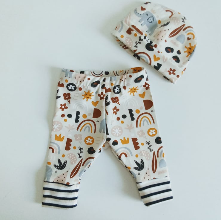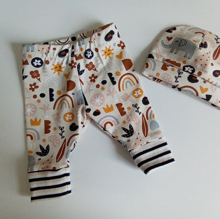 A preemie set of leggings and hat in a cute elephant design jersey fabric, a unisex design so ideal for boy or girl.