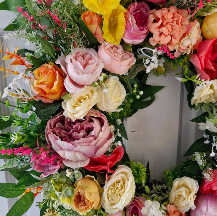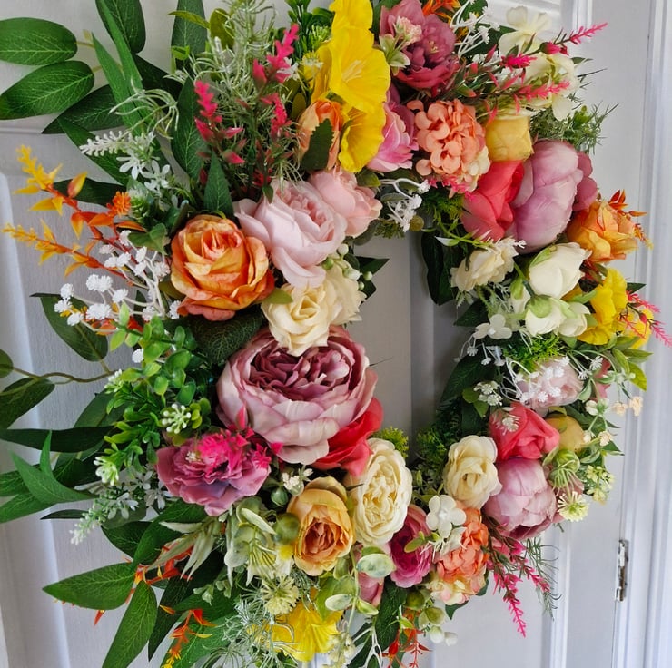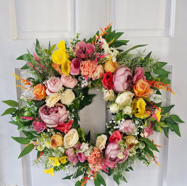 Dress your door with this pretty summer multi colour, mixed floral wreath. A mixture of various pink peonies,cream & vintage orange roses, camelia, yellow petunias,hydrangeas & white gypsohilia.