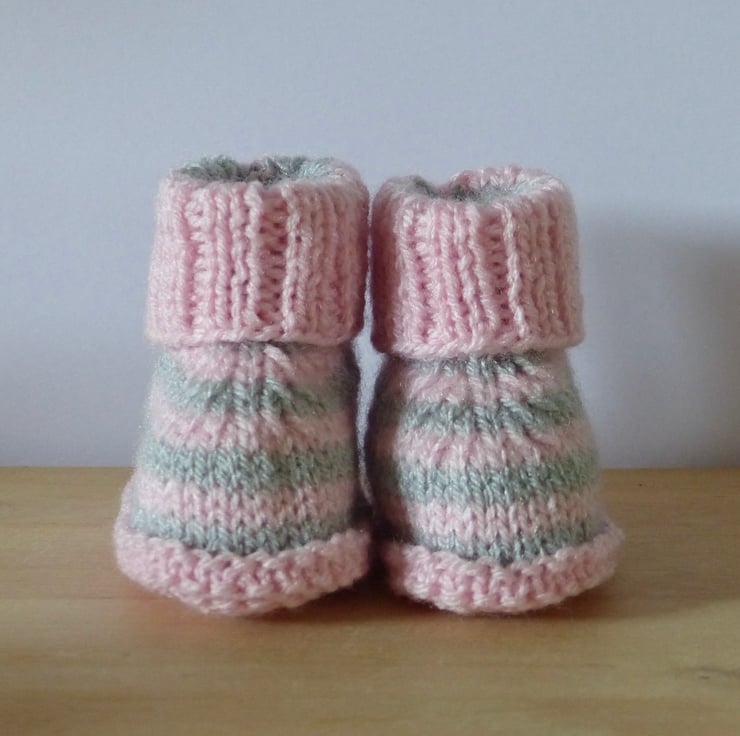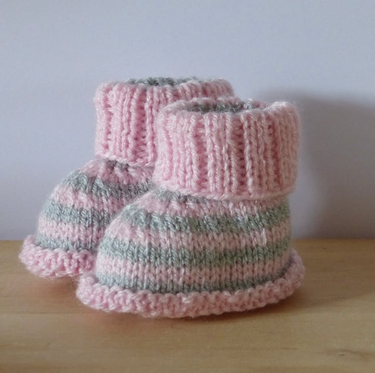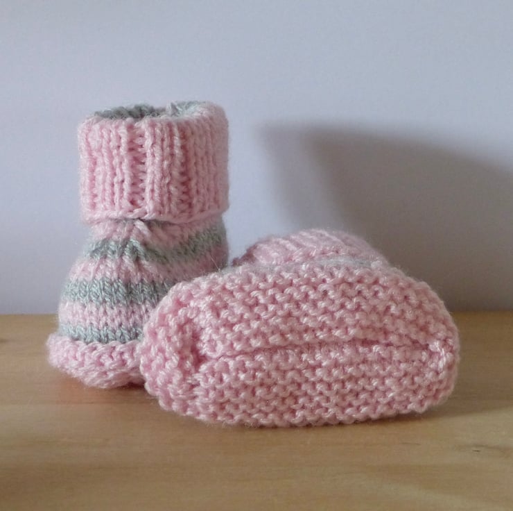 A pair of hand knitted Baby Booties in 100% Acrylic yarns in light grey and pale pink