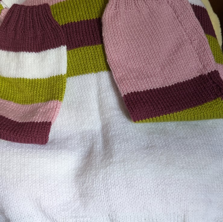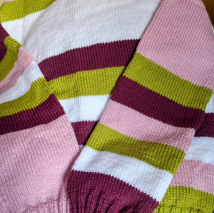 This jumper I call Neapolitan, after the ice-cream. Apart from anything it looks delish!. Knitted in a plain stocking stitch the colours are perfect enough to set it apart. Round neck style, long sleeved,