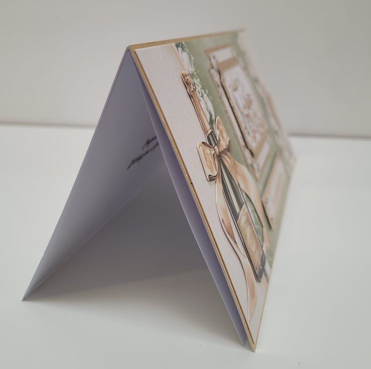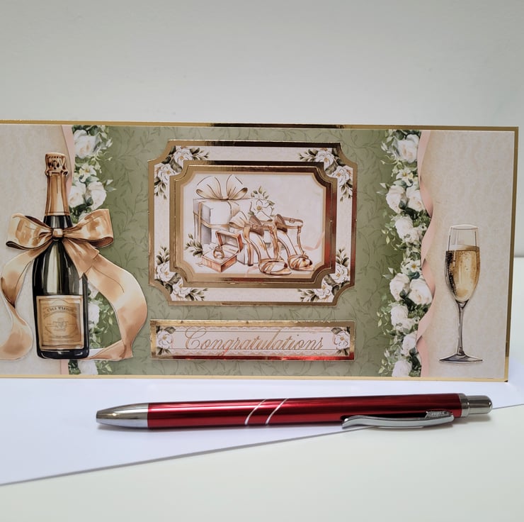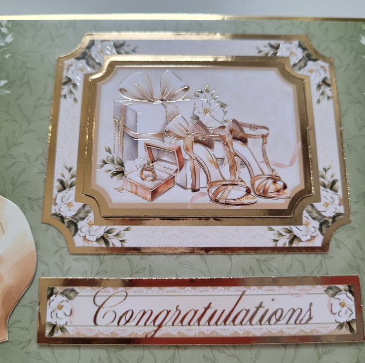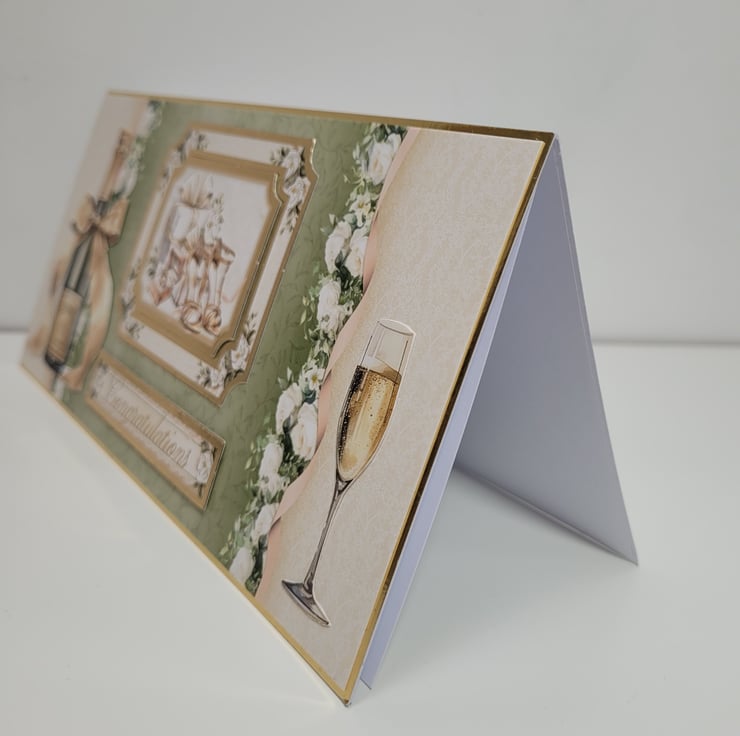 A beautiful slimline wedding congratulations card in soft ivory, white and green tones, together with gold accent foiling.