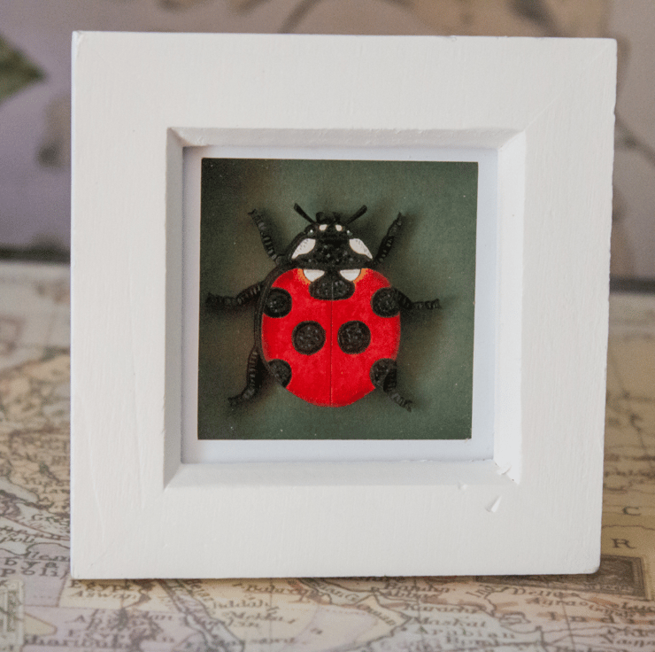 Each layer is precisely cut and assembled to highlight the ladybird’s classic red shell and bold black spots. Set against a soft green background and housed in a compact white box frame with a white mount, this tiny treasure is ready to sit on a shelf, brighten a windowsill, or add a playful pop to a gallery wall.