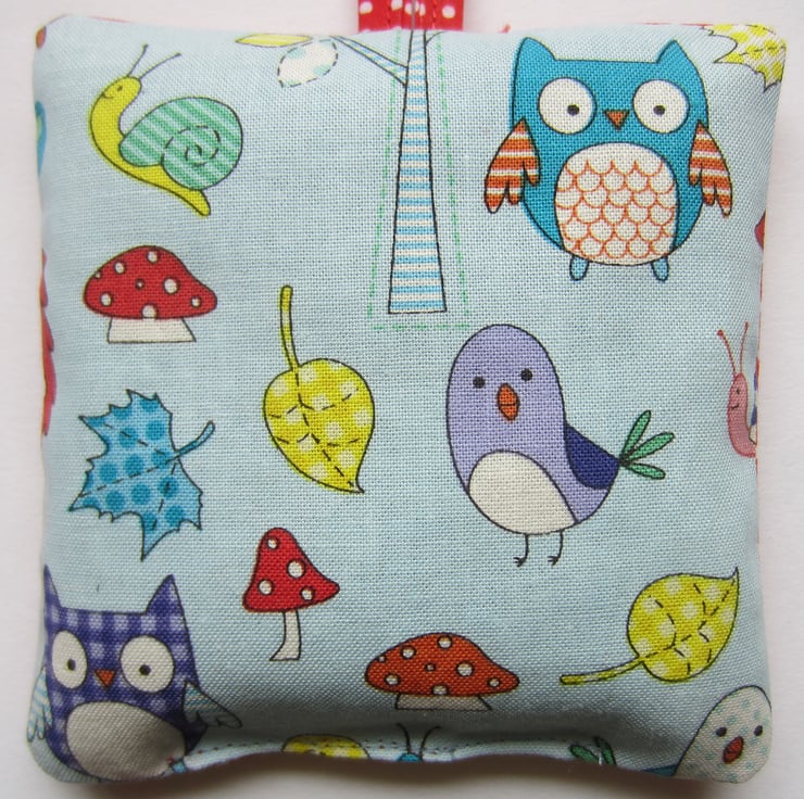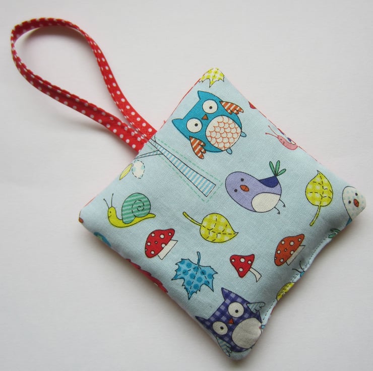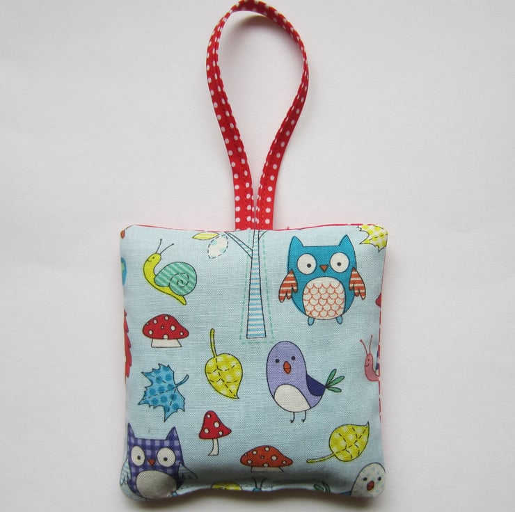 Hanging lavender sachet made from a cute owl, bird and toadstool fabric. It is backed with a coordinating red and white spotty fabric.