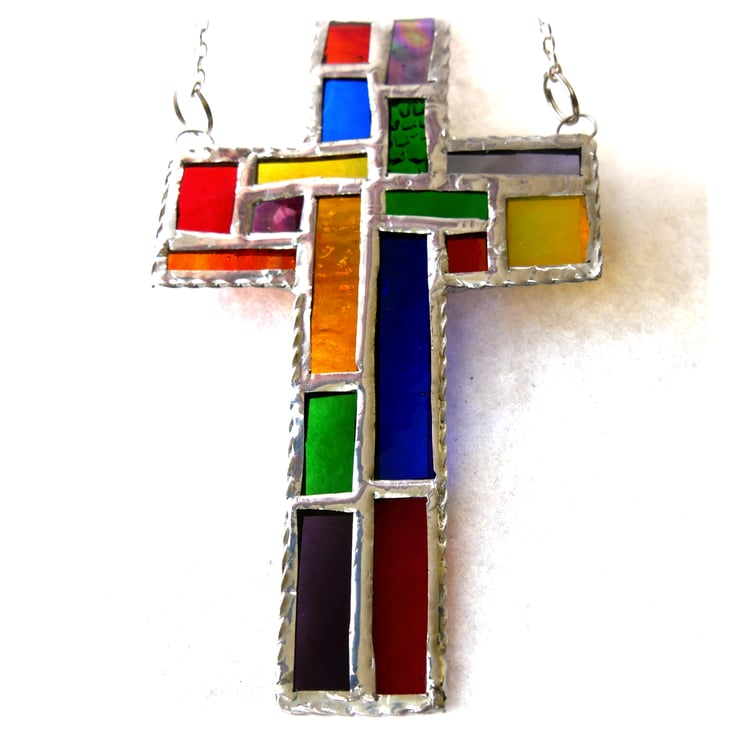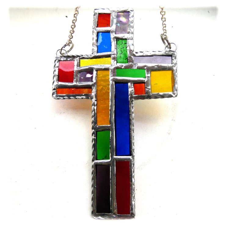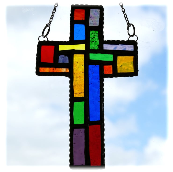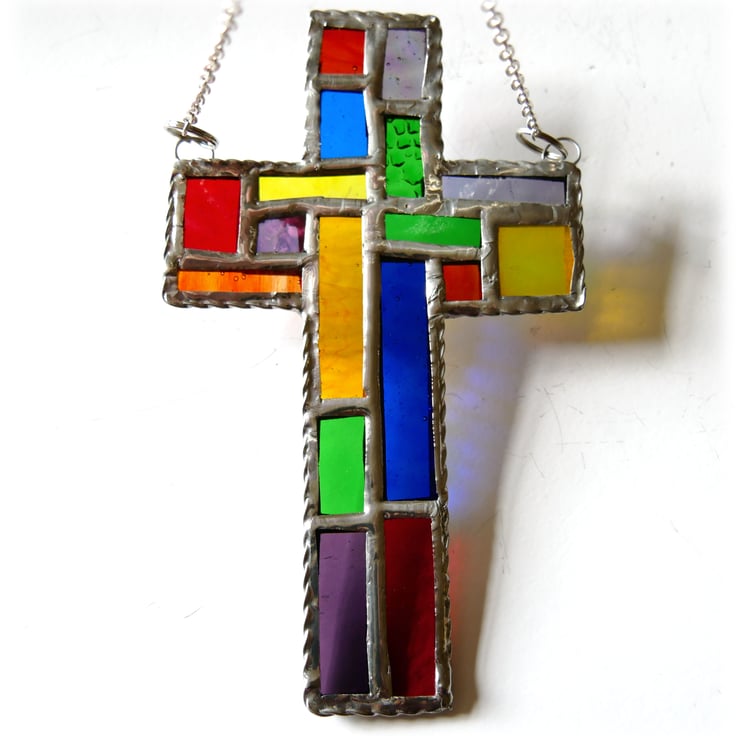It is a simple cross shape but the patchwork arrangement of colours is classic stained glass design.
