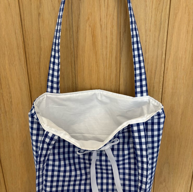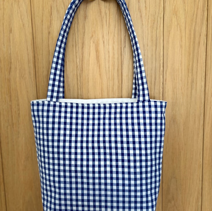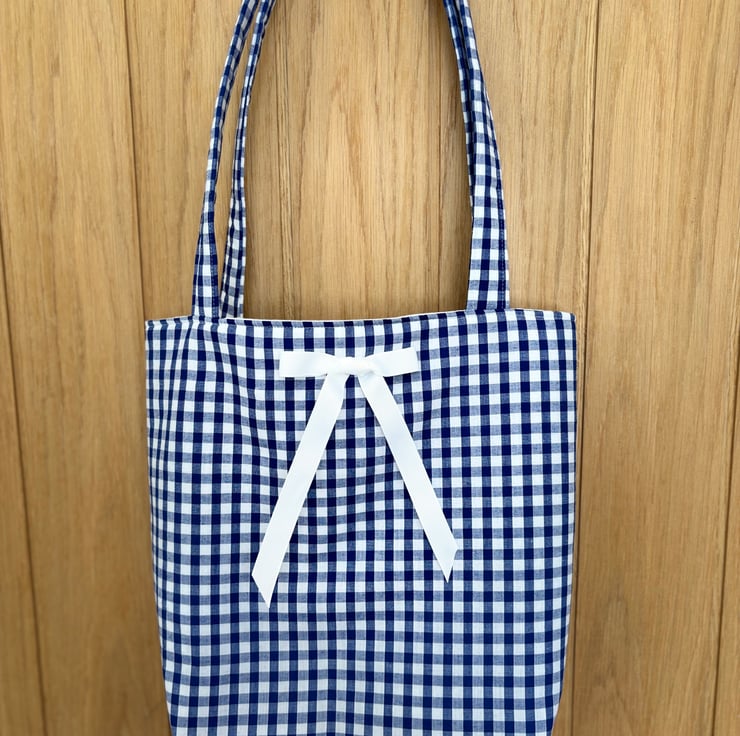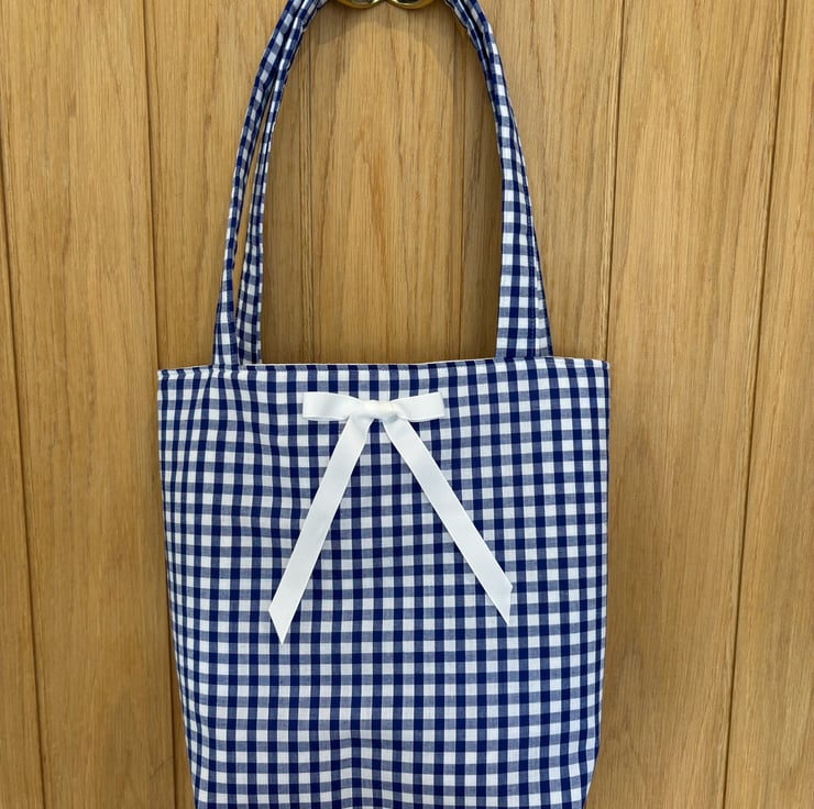 A beautiful handmade navy gingham small tote bag with a lovely bow embellishment.