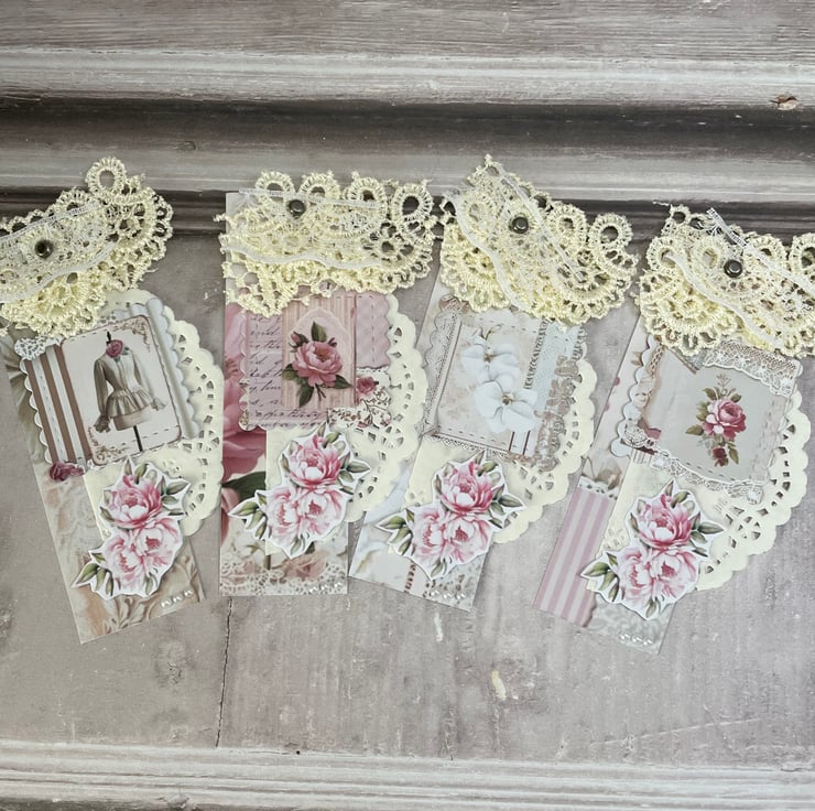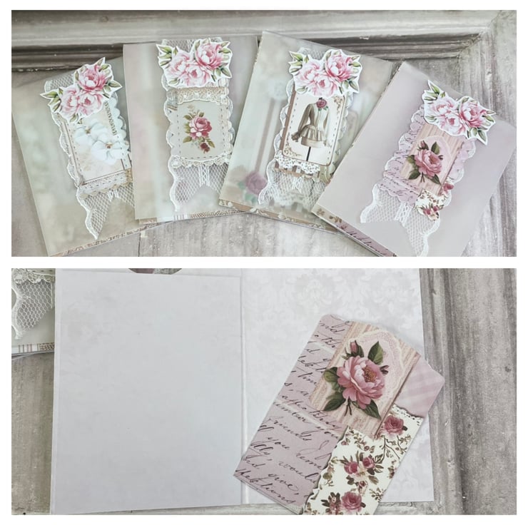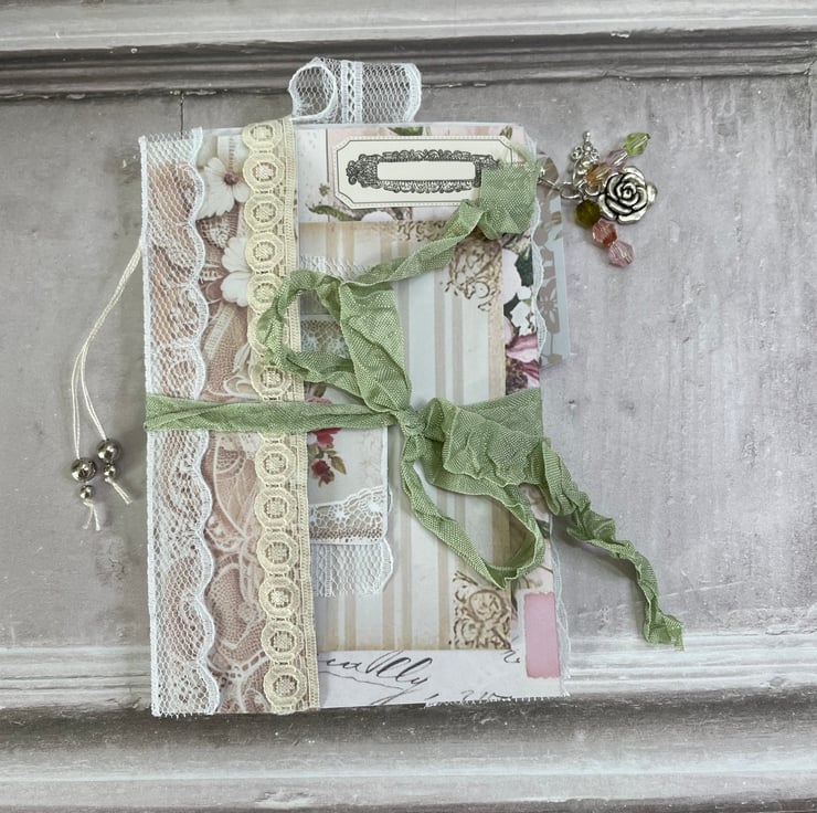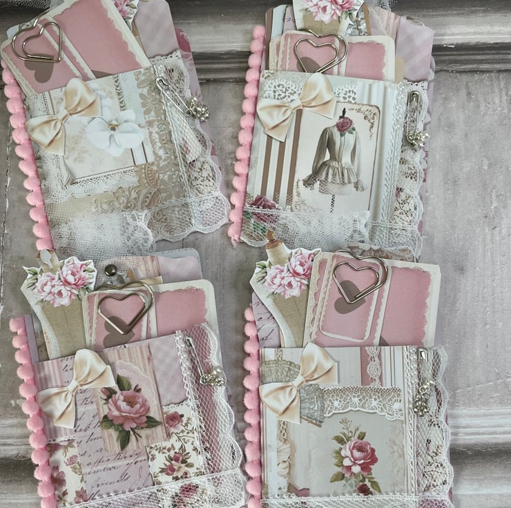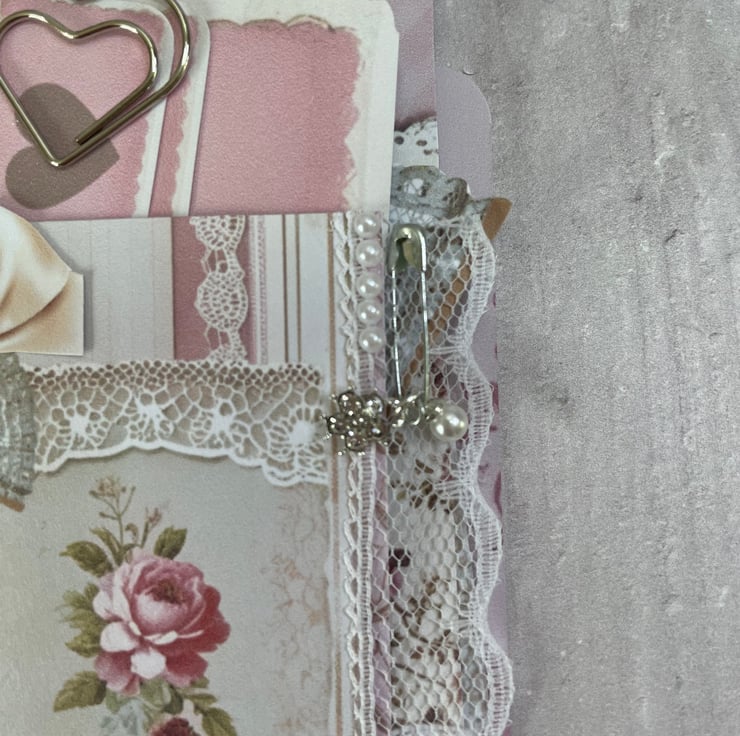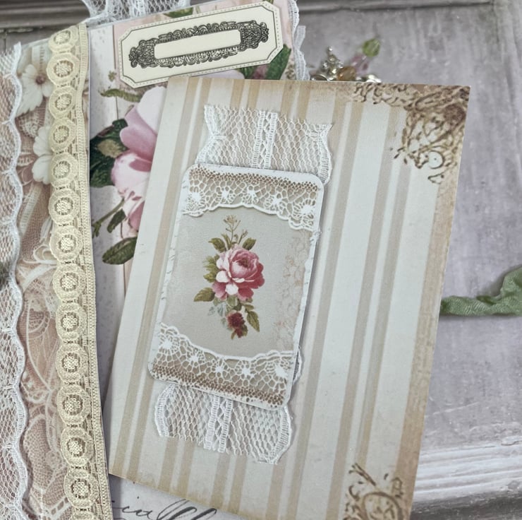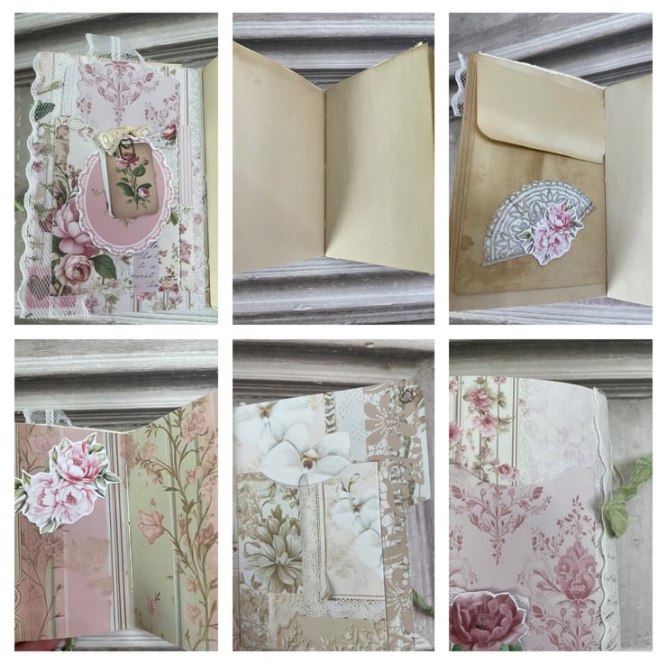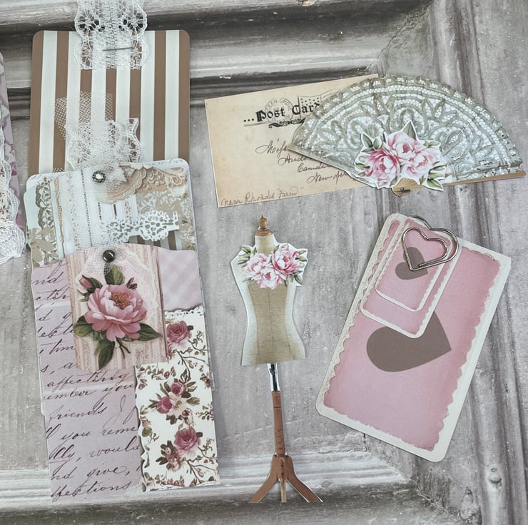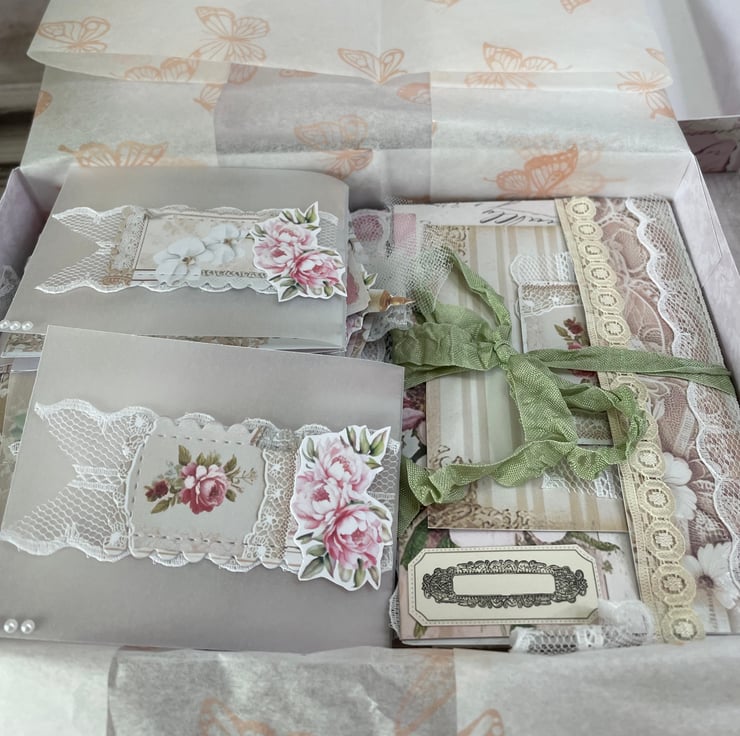 Pretty box in a rose patchwork print. Inside a beautiful mini journal with 32 pages, 1 envelope, 3 pockets and 5 tags. Also included a set of 4 page edgers, add to your journal pages, 4 pockets and tags, 4 vellum flip notecards. Wrapped on white tissue with rose gold butterflies. A box of delights.
