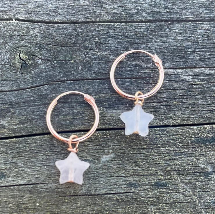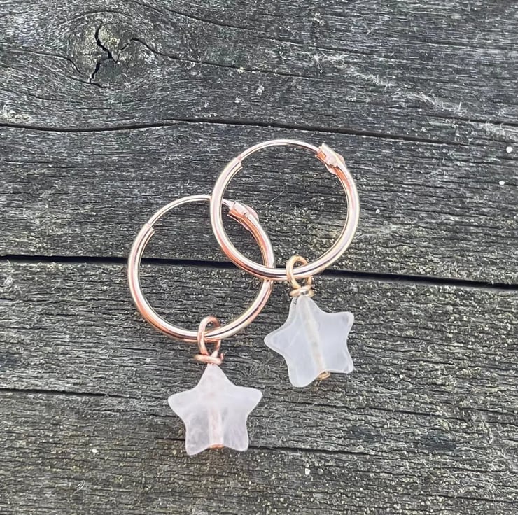 9ct 11mm rose gold hoop earrings, hallmarked 375. A thin style hoop, 1mm in thickness with 7mm rose quartz star charms, very gift box tied with ribbon. I can make a multiple order if needed so please ask.