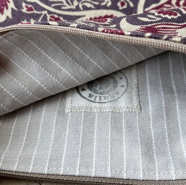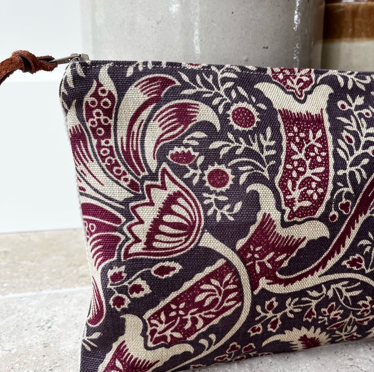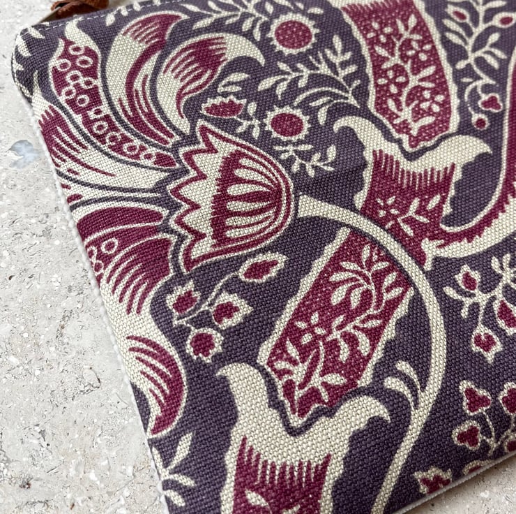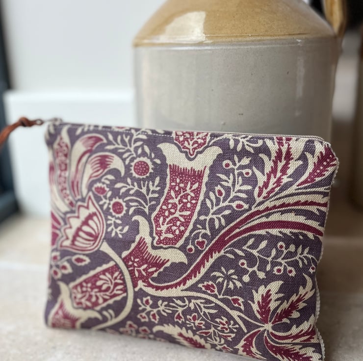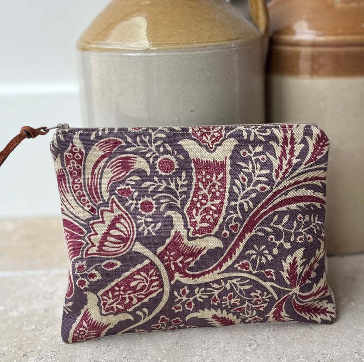 Pretty William Morris linen zip pouch. This little bag has been made from Morris and Co Indian linen in soft shades of purple and plum. It is backed with beige corduroy fabric from a sample swatch leftover from the fashion industry. The pouch is fully lined with a beige textured sample swatch.
