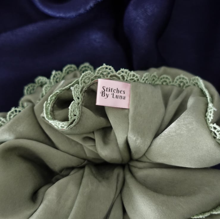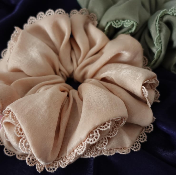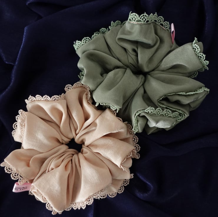 Oversized Mini Lace Trim Scrunchies in Soft Velvety Satin fabric