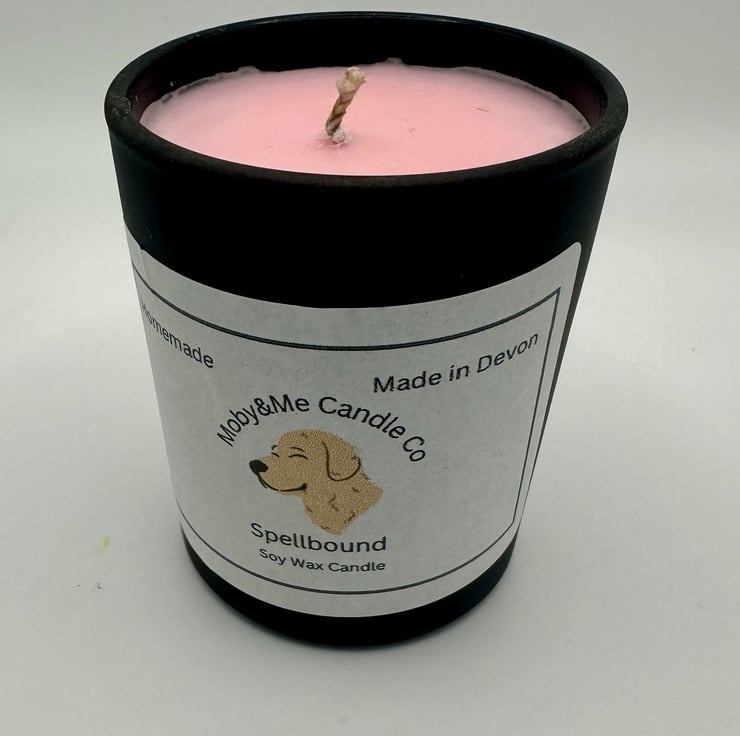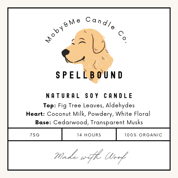 The "Spellbound" natural soy candle by Moby & Me Candle Co. offers an enchanting fragrance journey. It opens with the fresh, green notes of fig tree leaves blended with crisp aldehydes, creating an invigorating top layer. The heart reveals a creamy fusion of coconut milk, powdery accents, and delicate white floral, evoking a soft, comforting essence. Anchoring the scent, the base notes of rich cedarwood and transparent musks provide a warm, grounding finish. Handcrafted with 100% organic ingredients, this 75g candle delivers up to 14 hours of mesmerising aroma, truly "Made with Woof."