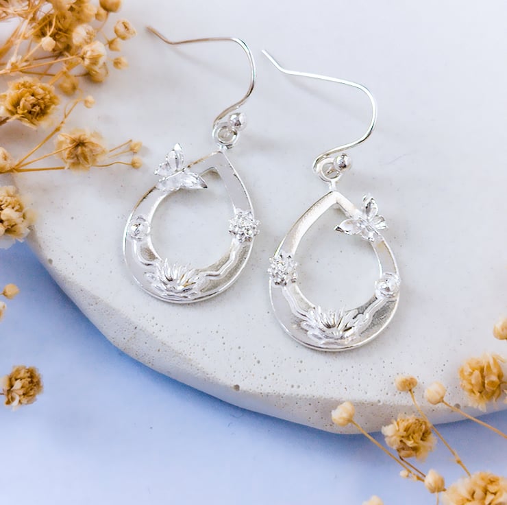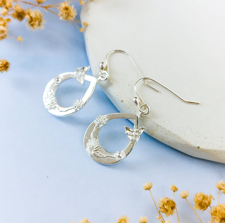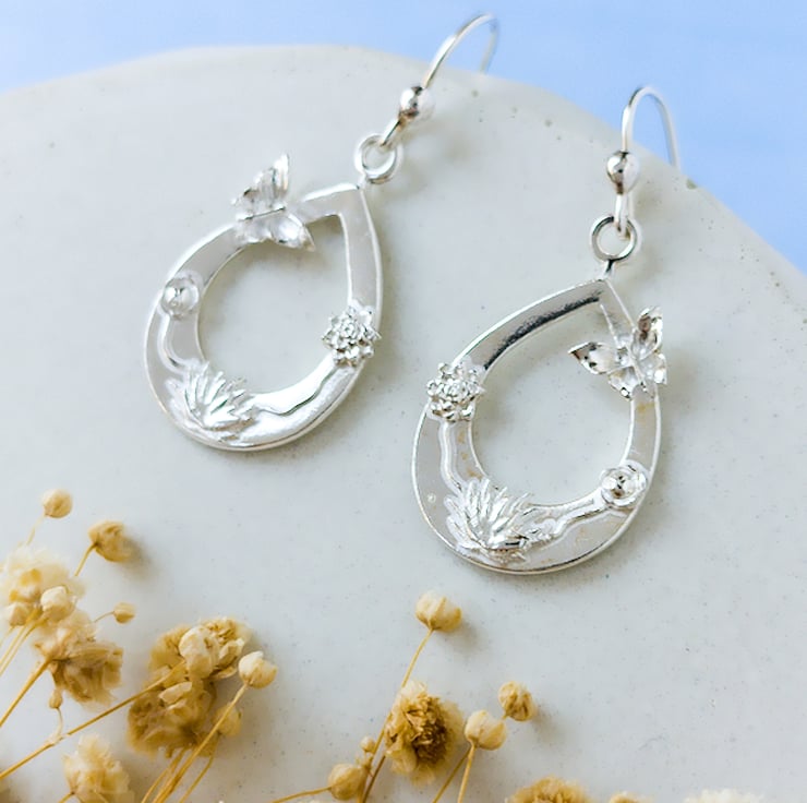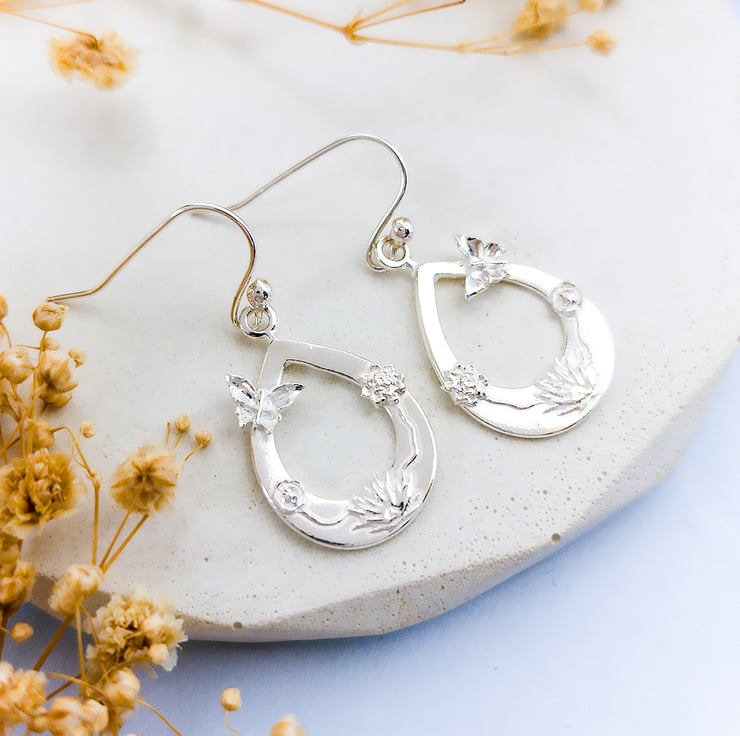 Delicate, detailed, and full of charm — these handcrafted earrings are a celebration of nature’s tiniest treasures. Made from recycled fine silver (99.99% pure), each teardrop is adorned with graceful butterflies, miniature flowers, and delicate leaves, all carefully sculpted by hand using silver clay.