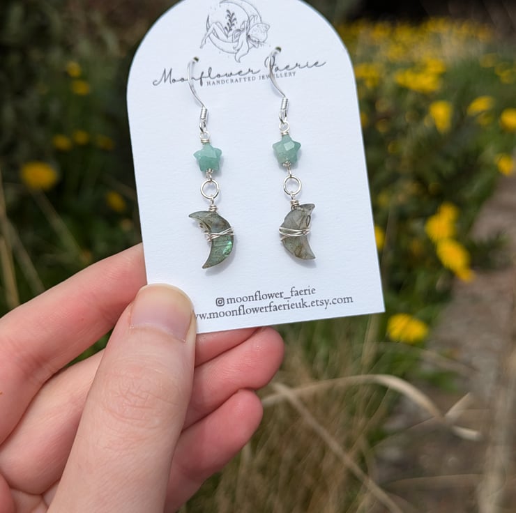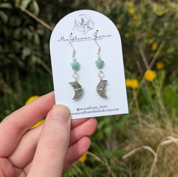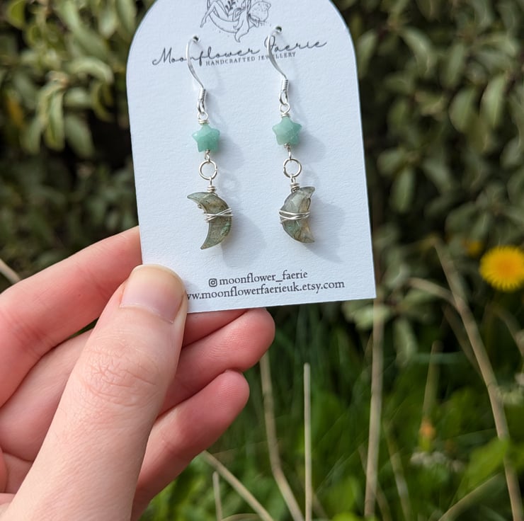 Gorgeous flashy labradorite moons wrapped in silver plated wire, dangling from amazonite stars on silver plated hooks.