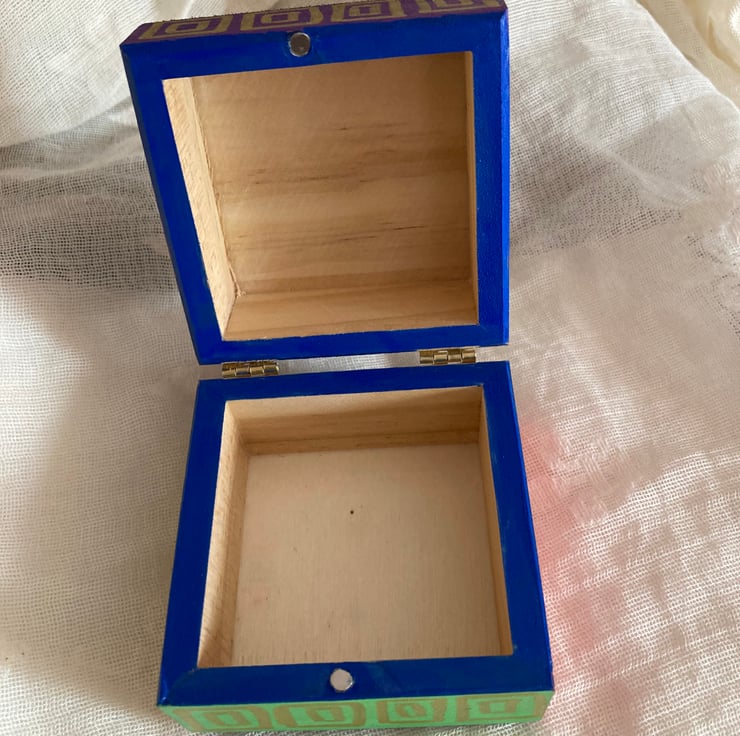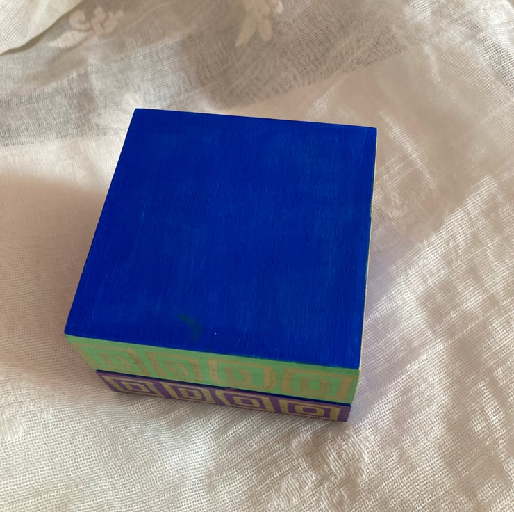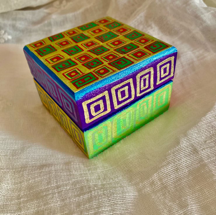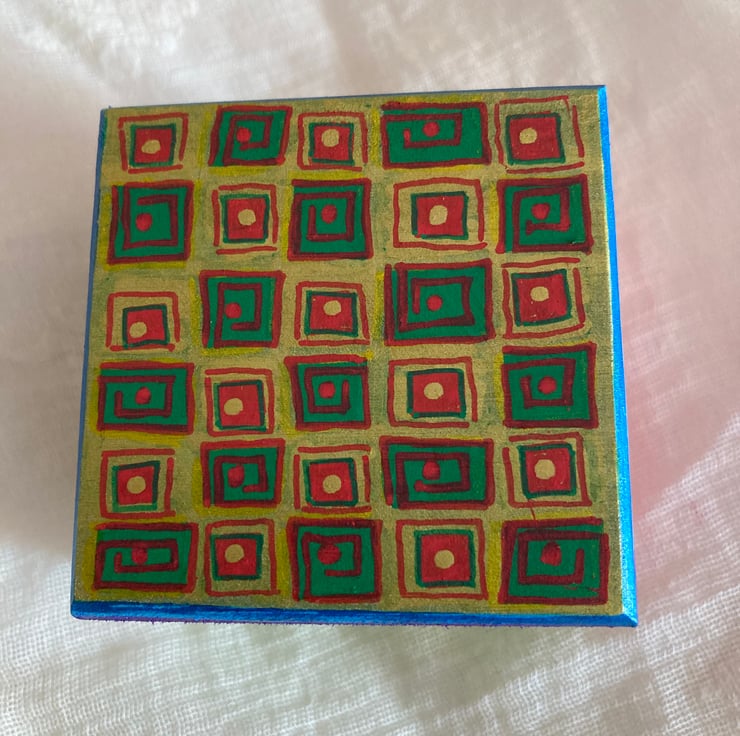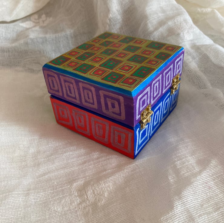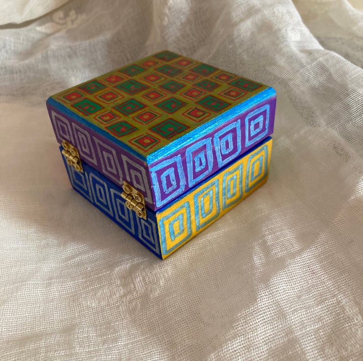 This wooden box has been hand painted in lots of different colours with square like patterns.