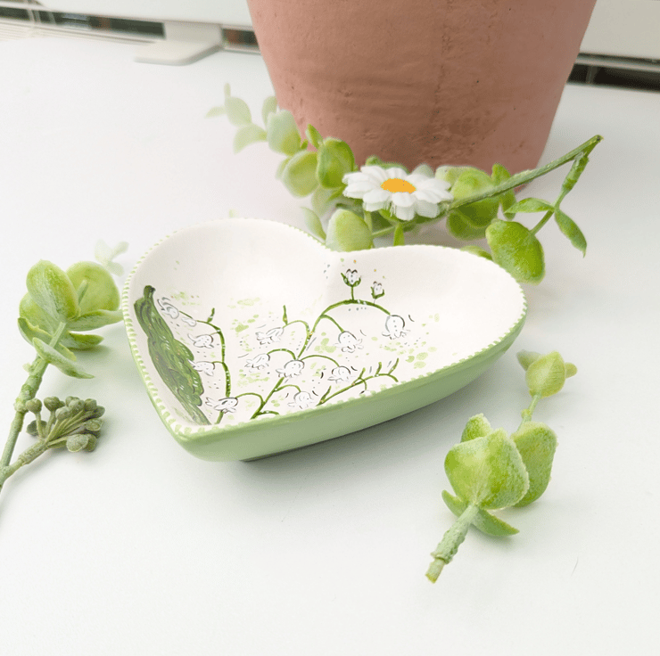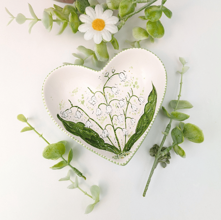 A beautiful hand-painted heart shaped ceramic lily of the valley ring/ jewellery dish. Lovingly painted in acrylics and sealed with a gloss varnish.