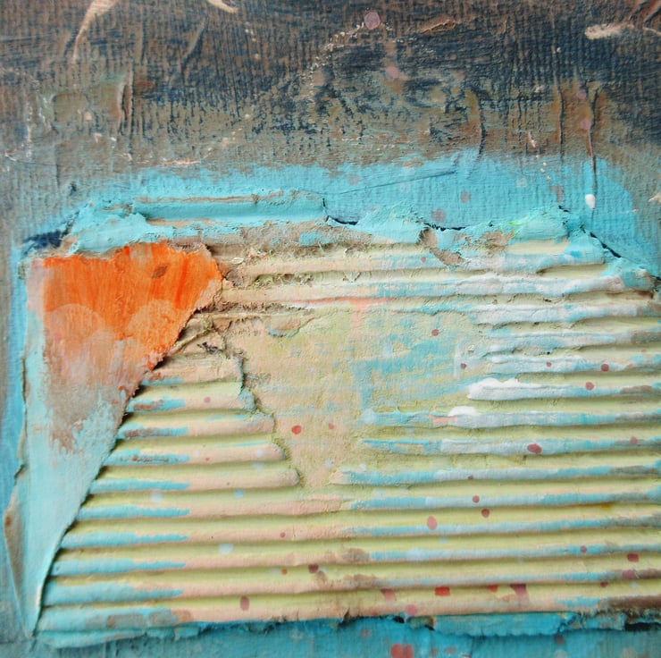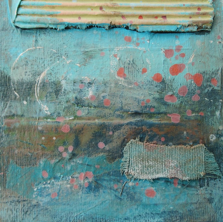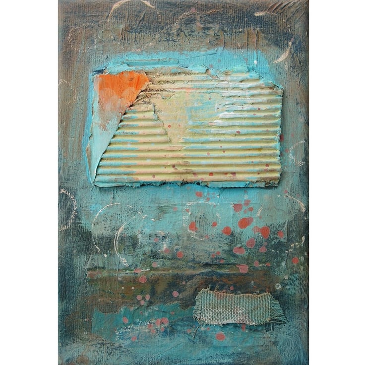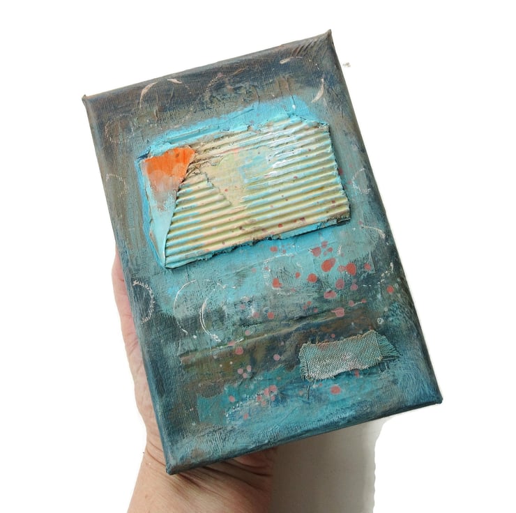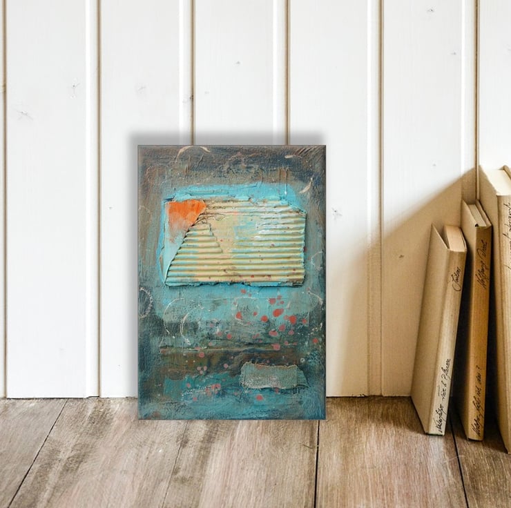 Small mixed media abstract painting in acrylic and collage, on 5 x 7 inch canvas, based on coastal themes and colours. The 0.75 inch edges of the canvas are painted so no framing is necessarily required, it can, of course, still be framed for further impact. In a beautiful colour palette with textured collage elements, and attractive and interesting paint splashes. Your artwork will be discreetly hand signed on the front before dispatch.
