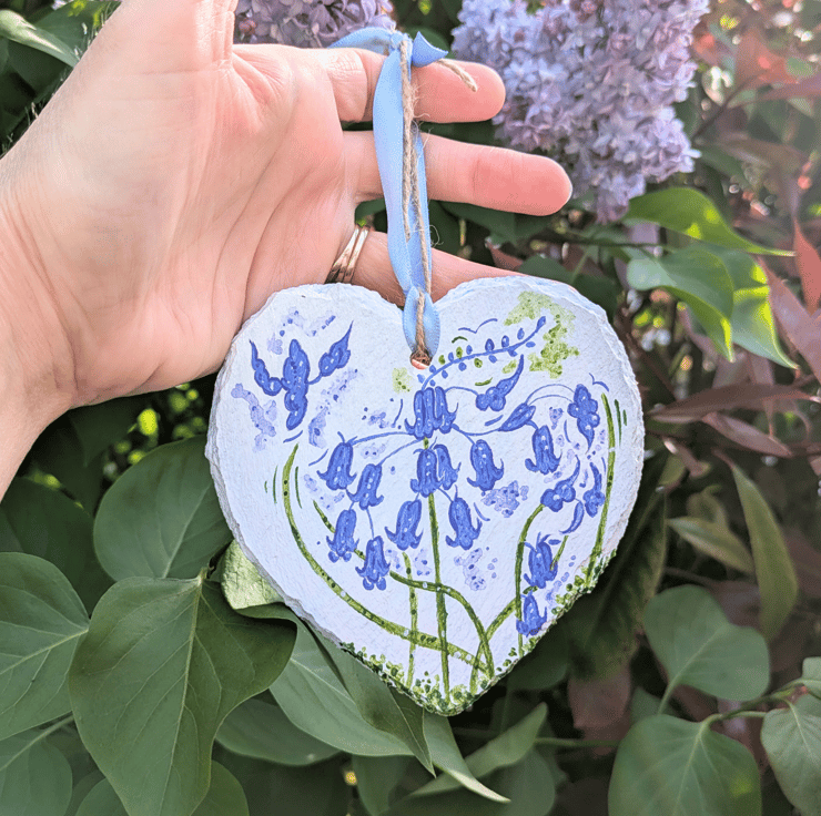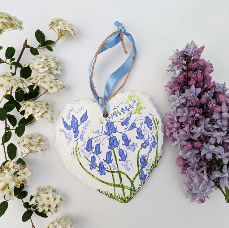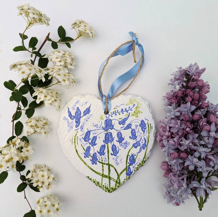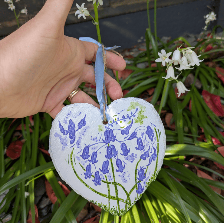 A beautiful hand-painted bluebell slate heart hanging ornament. The bluebell heart has been lovingly hand-painted in acrylics and varnished with a gloss varnish.