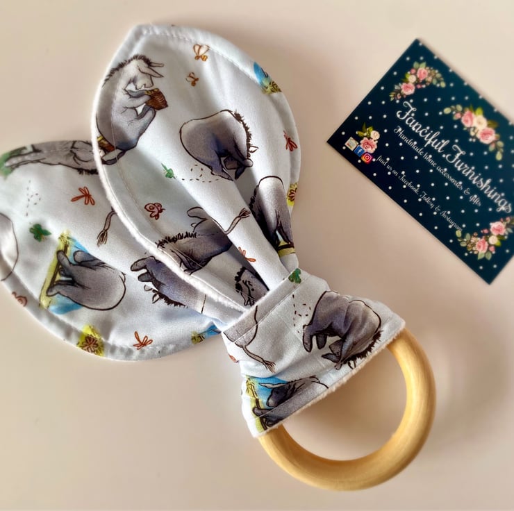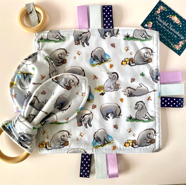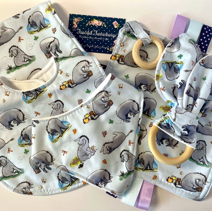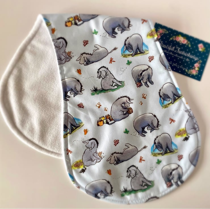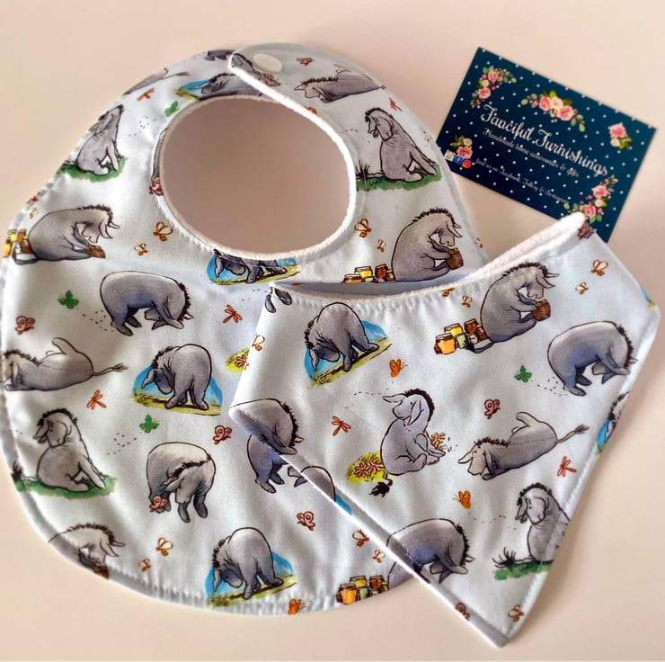 Front fabric is 100% cotton and has a fabulous Eeyore design. All five pieces are backed with a beautifully soft micro fleece fabric. Bibs sized for approximately 3 months onwards but depends on the size of your baby, both closing with a plastic popper fastening.