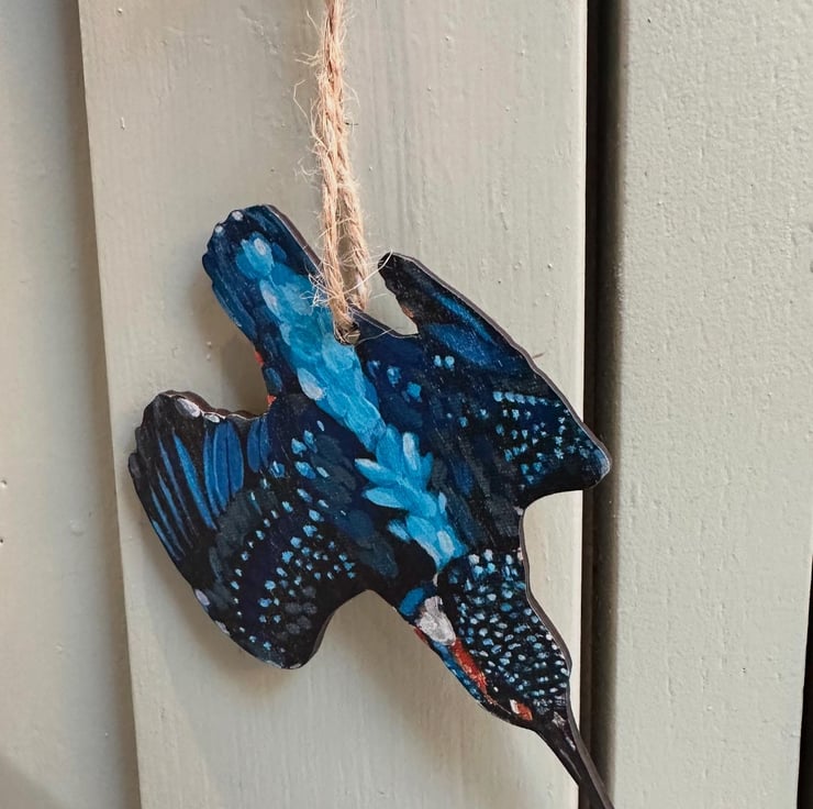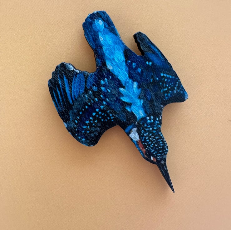 Kingfishers are such a beautiful and striking bird, often seen as a flash of blue along river banks. I only saw my first kingfisher a couple of years ago but it was incredible. I felt privileged to see the bird and couldn’t take my eyes off him. The way these birds dive into the water and catch fish is amazing. I wanted to create an interesting shape and design of this beautiful bird in action.