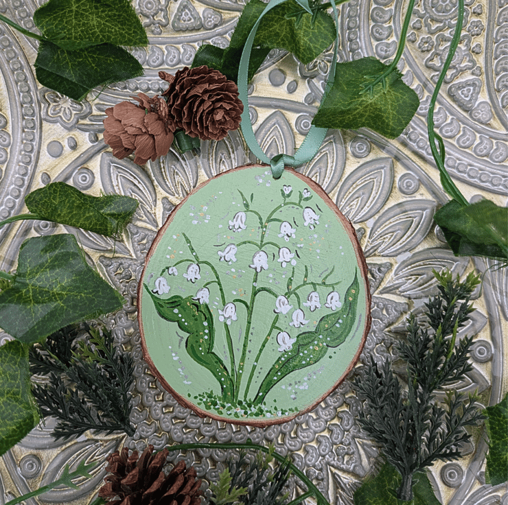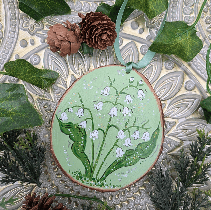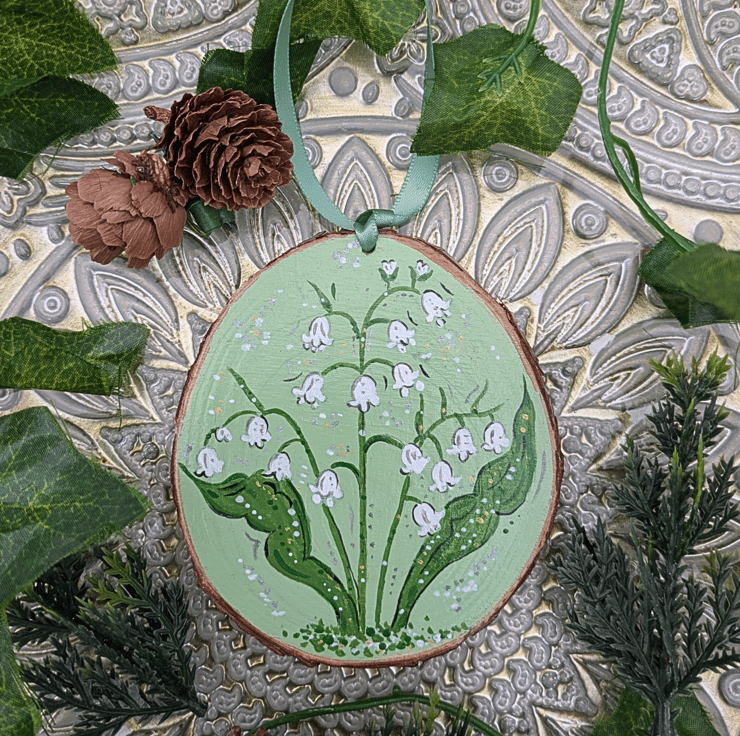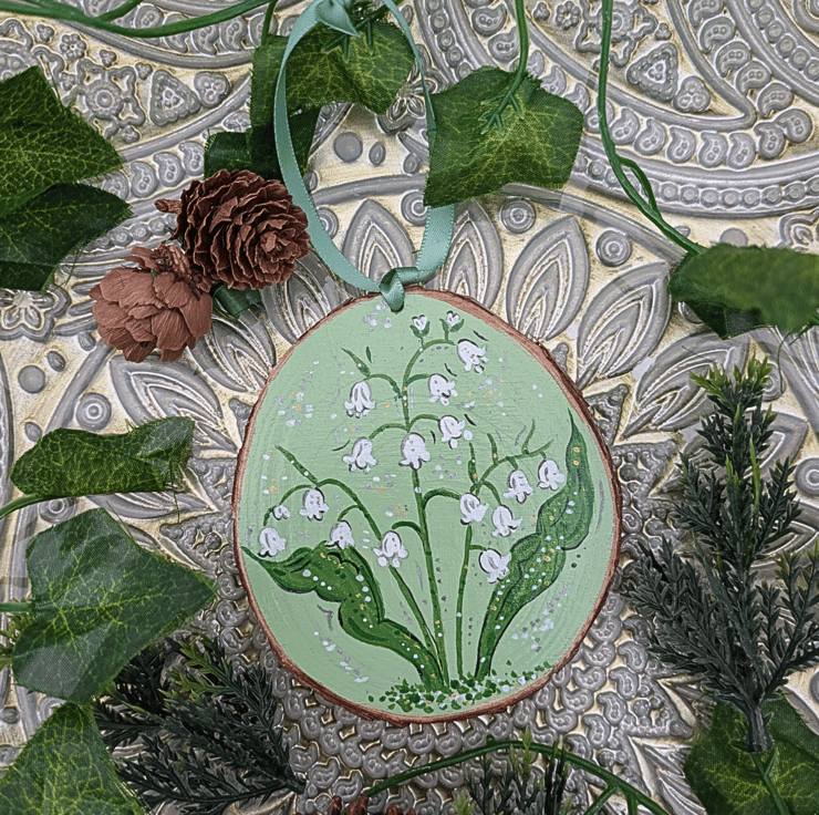 A beautiful hand-painted Lily of the valley log slice hanging ornament. Lovingly painted in acrylics and varnished with a gloss varnish.