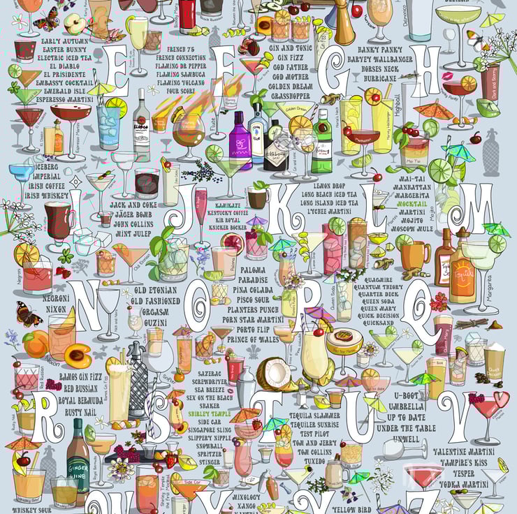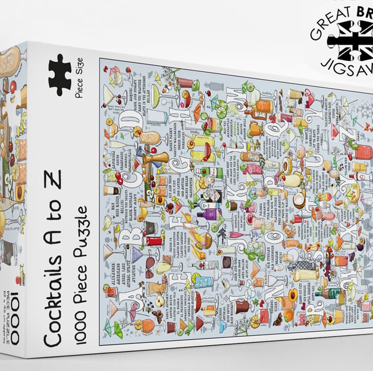 A beautifully illustrated jigsaw puzzle with cocktails from A to Z, 100% designed and made in England. The puzzle is printed on high quality recycled card and has a lovely silky touch, perfect for the victorious puzzle rub many puzzlers like to do on completion.