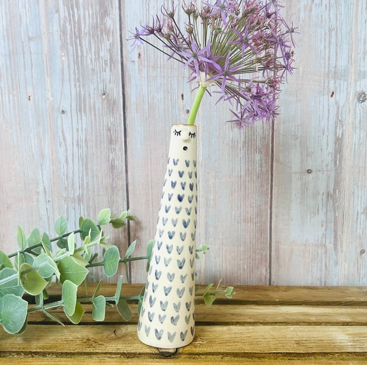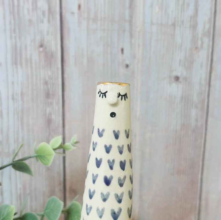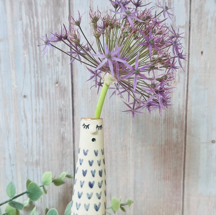 Each vase is made using the slab building technique. I add their faces then color/carve and decorate them making each one totally unique. They are all finished with a 24k gold lustre rim and some have the addition of more gold on the bodies.