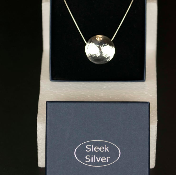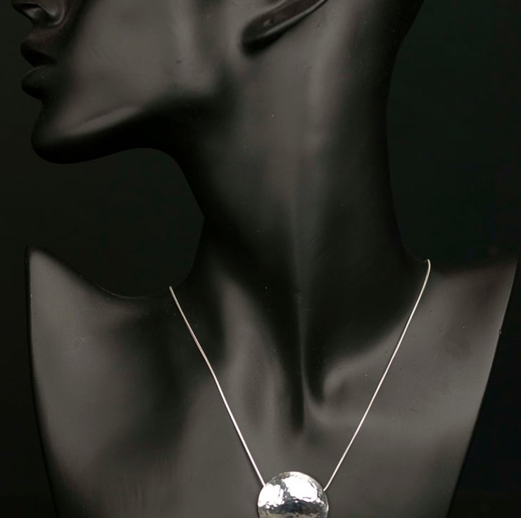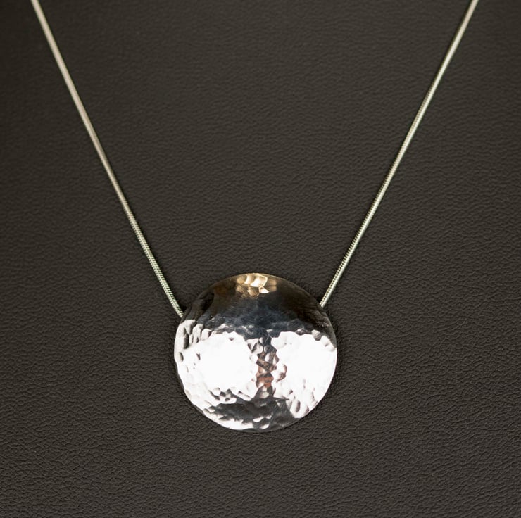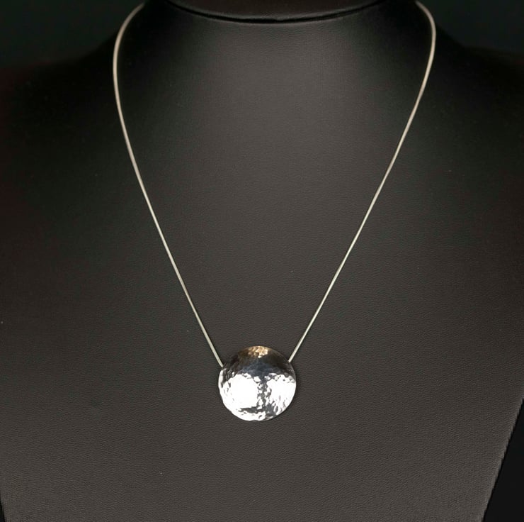 A striking planished (hammered) pendant in fine Sterling Silver with a brilliant mirror reflective finish. This beautiful pendant also comes with a fine 18" (45cm) snake chain. Contemporary, minimalist, sleek!