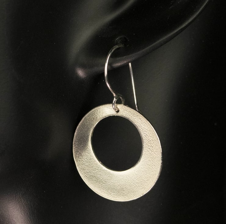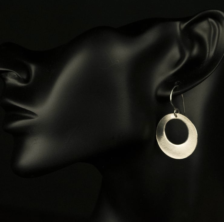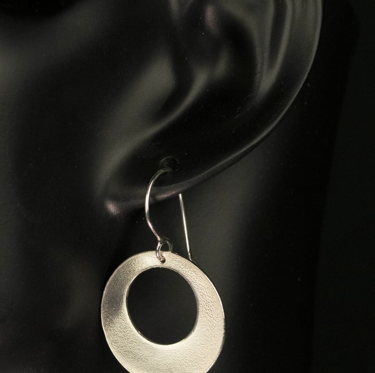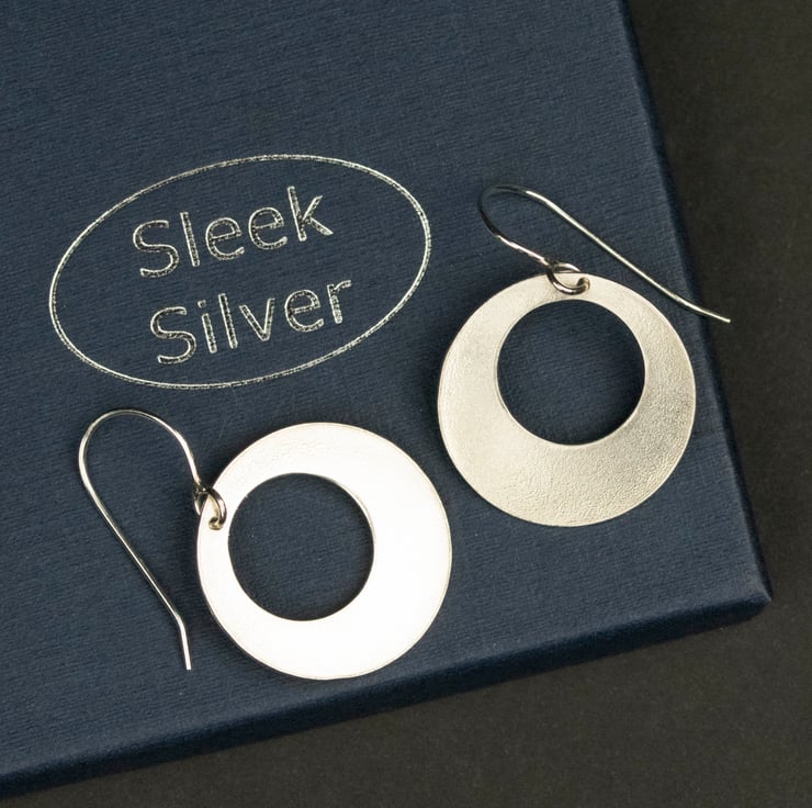A striking pair of drop earrings in fine Sterling Silver featuring an off-set disc. Contemporary, minimalist, sleek!