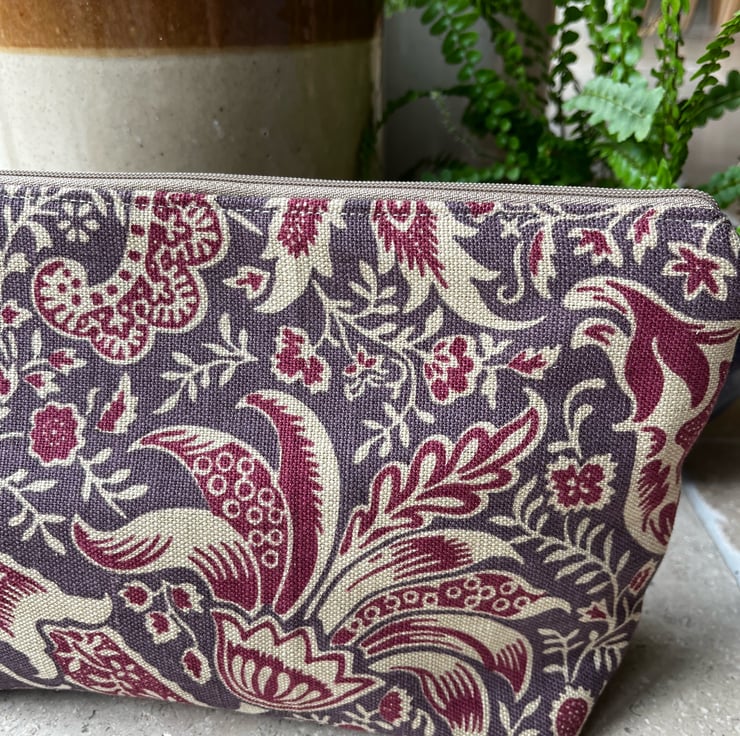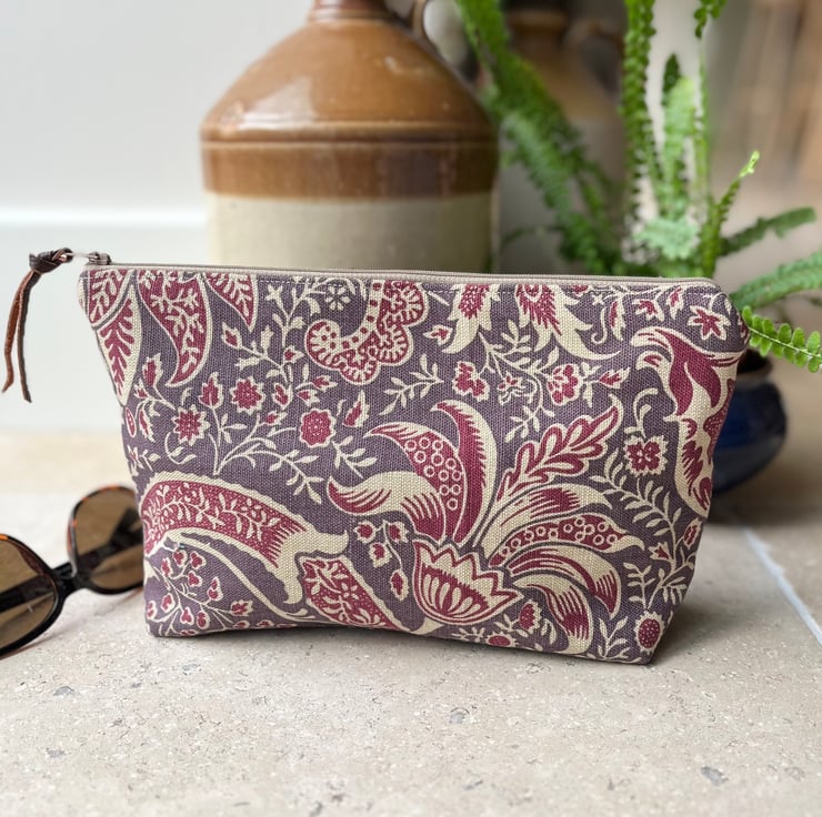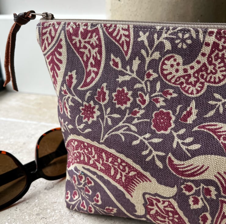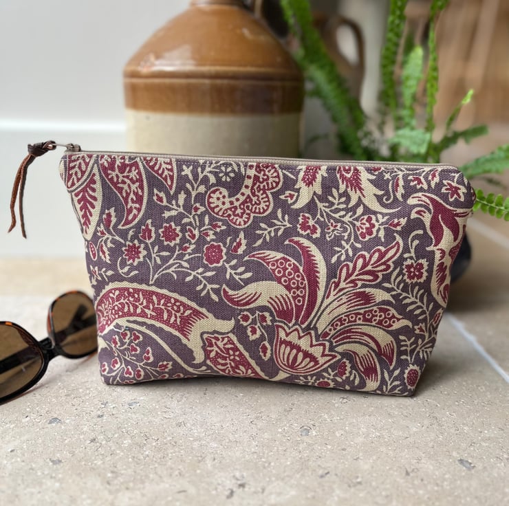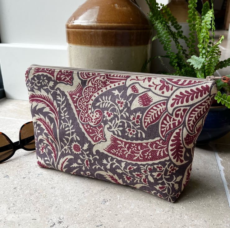 Large zip pouch ideally sized for organising your everyday essentials in your handbag. This beautiful linen is ‘Indian’ by William Morris.