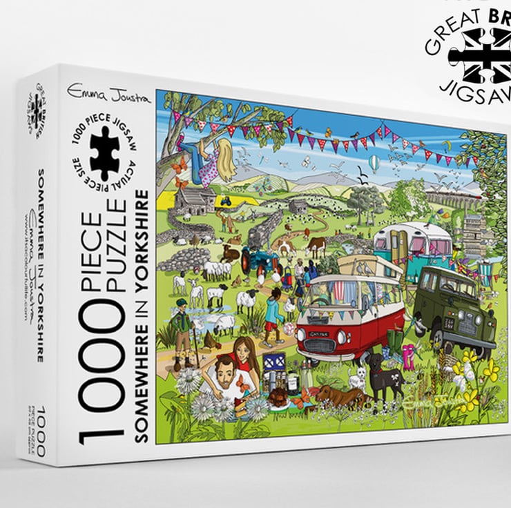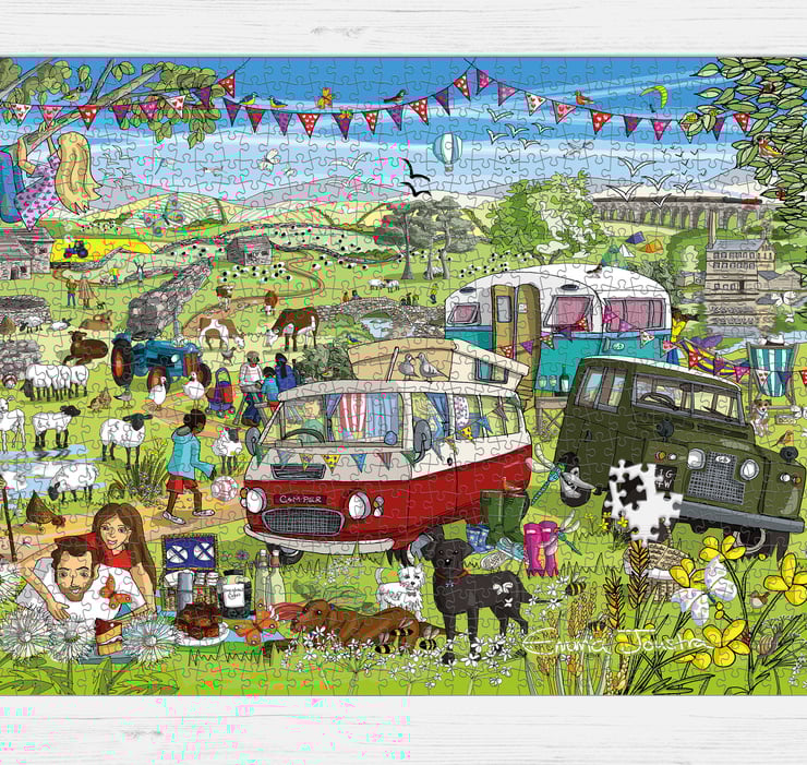 A beautifully illustrated jigsaw puzzle with campers and caravans on a lush green hillside with dry stone walls, sheep, and Yorkshire landmarks dotted around in the background . 100% designed and made in England. The puzzle is printed on high quality recycled card and has a lovely silky touch, perfect for the victorious puzzle rub many puzzlers like to do on completion.