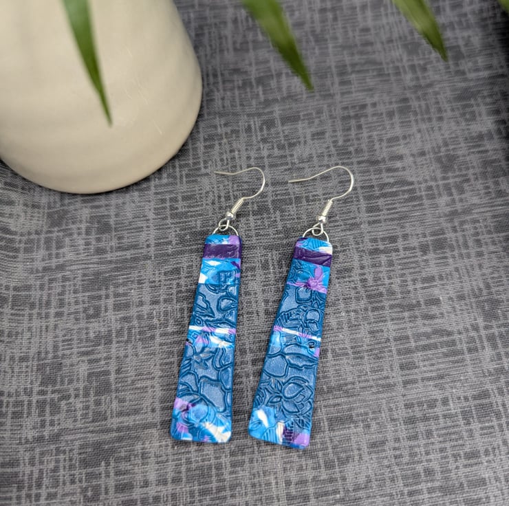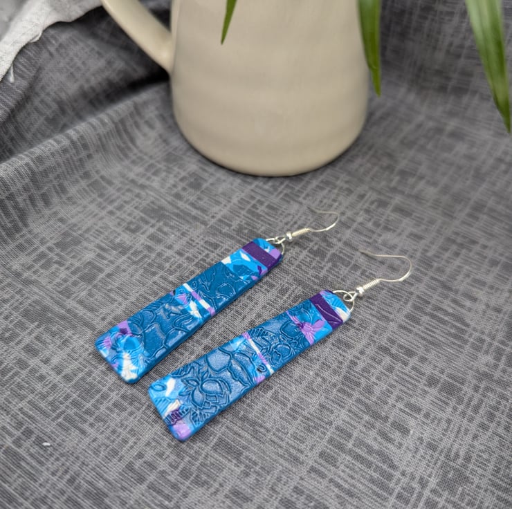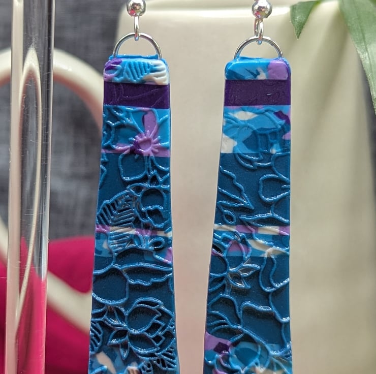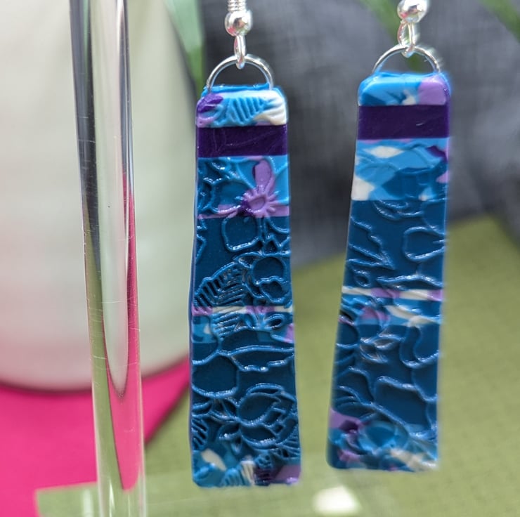Elegant and full of detail, these handmade earrings feature a beautiful floral imprint design in rich teal tones, highlighted with swirls of violet, white, and soft pink. The surface has been carefully textured to catch the light, adding depth and interest to the botanical pattern.