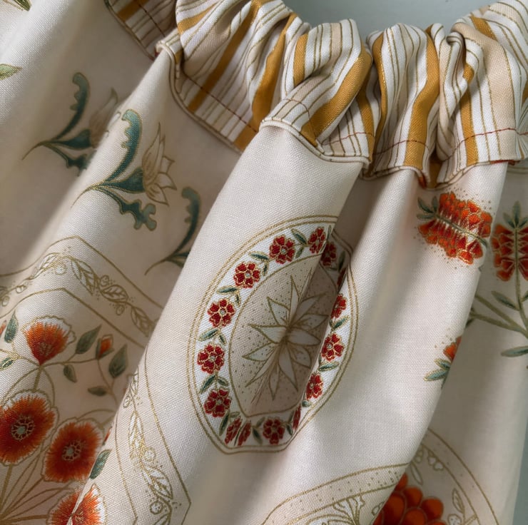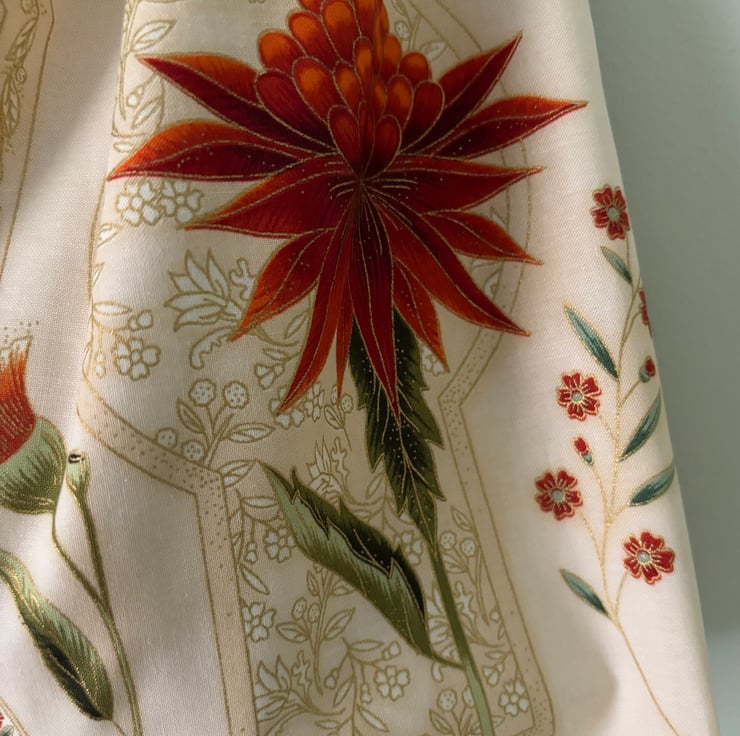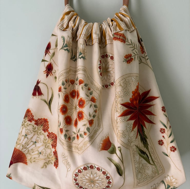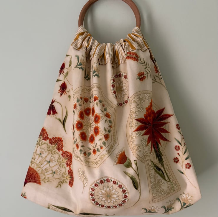 Round Handled Bag, the outside fabric has flecks of gold through the stems and Flowers and the lining fabric is stripes of yellow gold. 17 H X 14 W