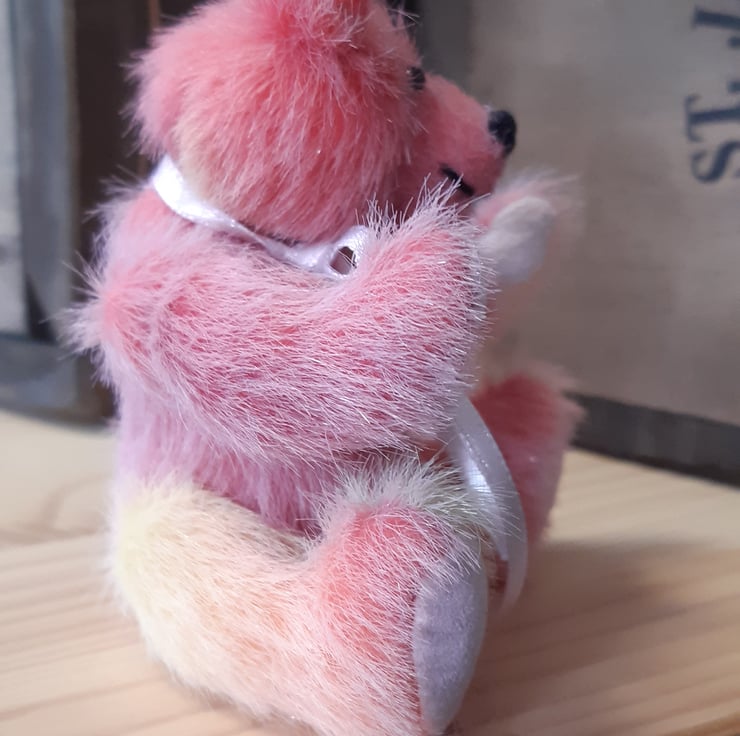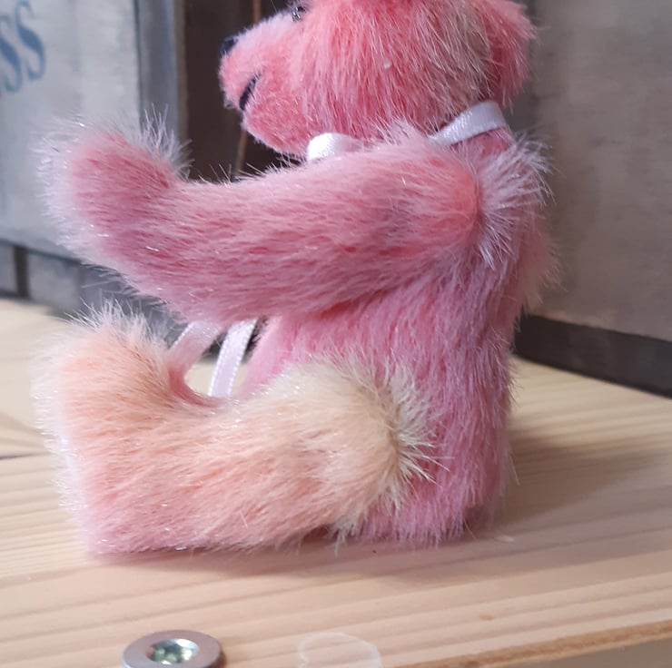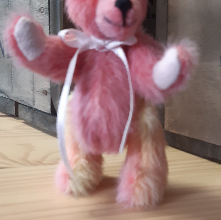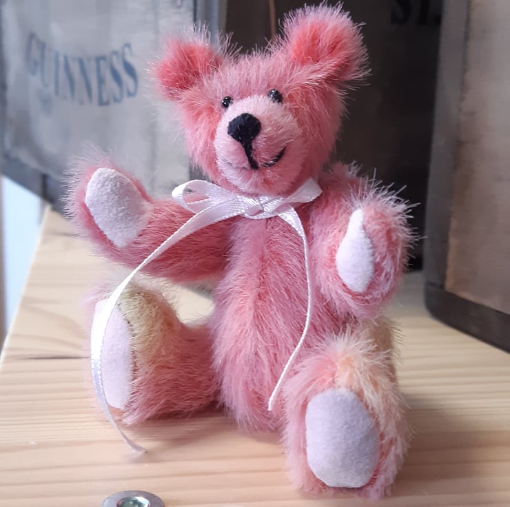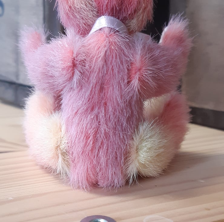 I made this gorgeous little fellow from hand dyed faux mohair, in different shades of pink and pale lemon (purchased from the lady that dyes the fabric). It has pale pink faux suede paws, glass eyes and is filled with polyfil. Approx 3 and a half inches tall. The head is fully able to turn due to its cotterpin joint and the arms and legs are thread jointed.