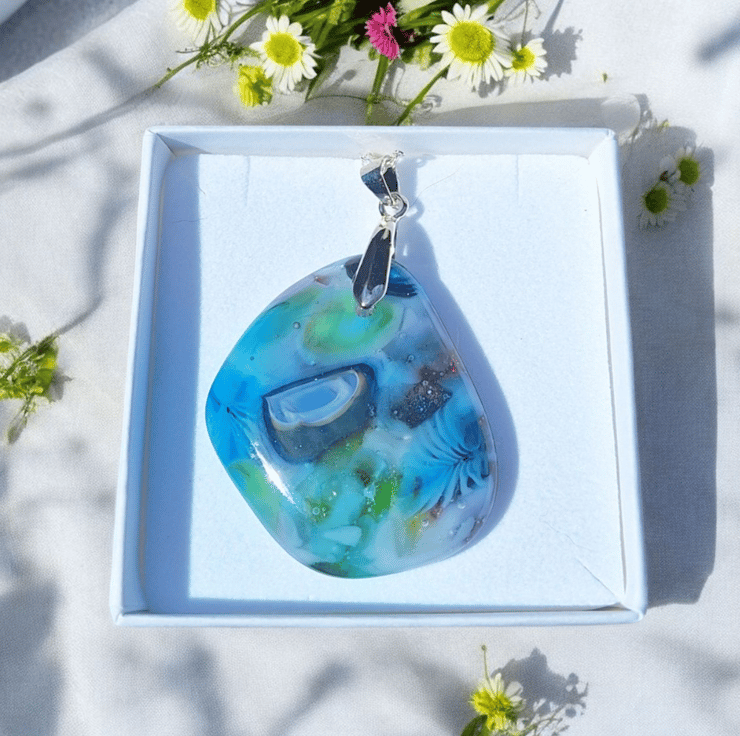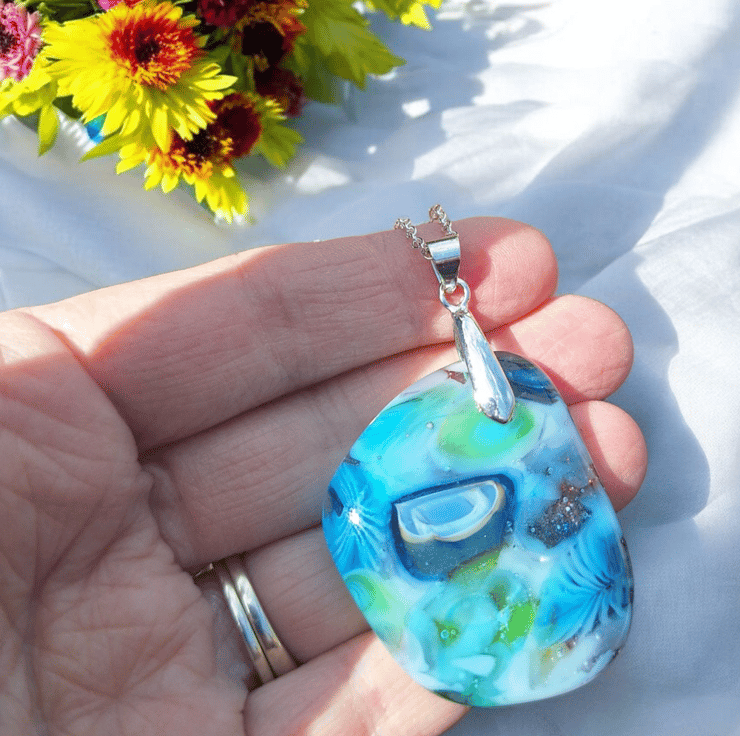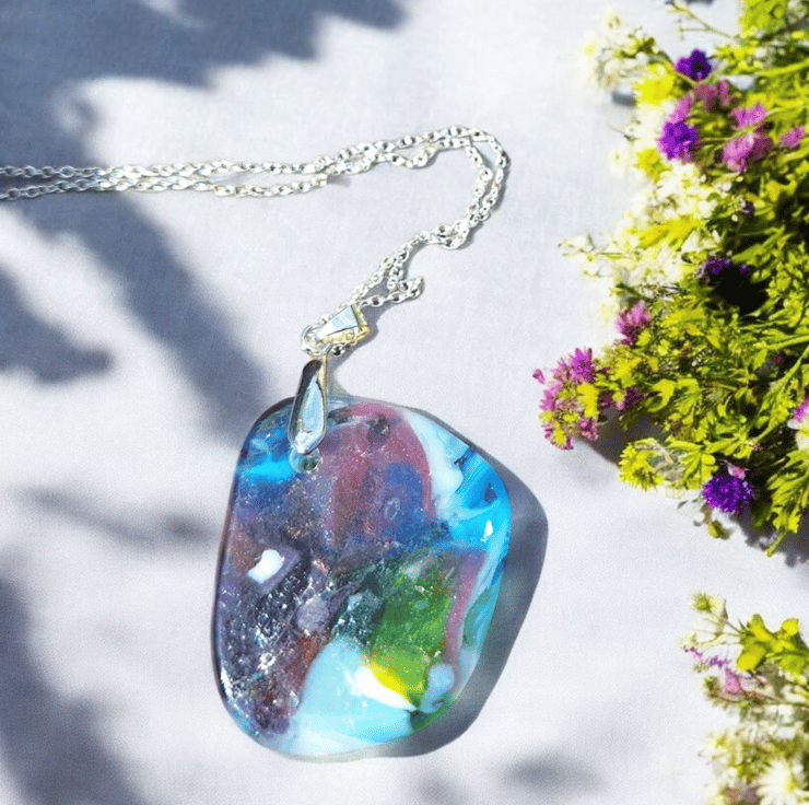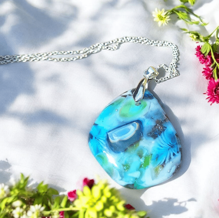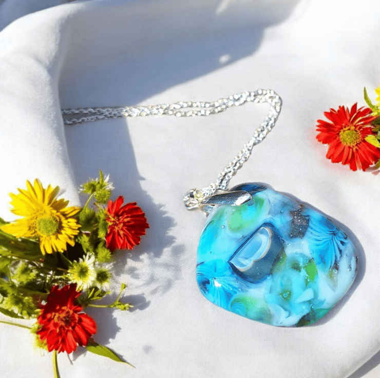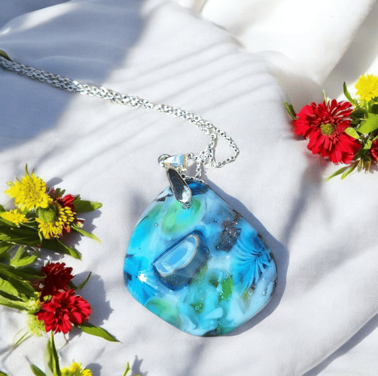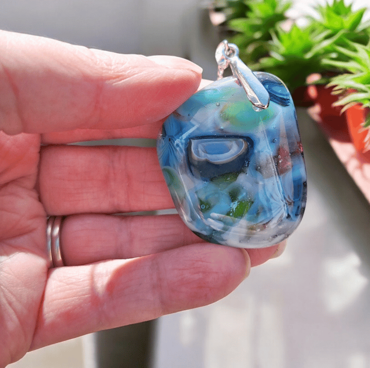 Swirling shades of blue and green glass are fused together in my kiln to create a glossy, nature-inspired pendant that’s both vibrant and unique. Once fired, I shape, drill and finish each one by hand, attaching a silver-plated pinch bail and threading it onto an 18-inch silver-plated chain with a secure clasp.