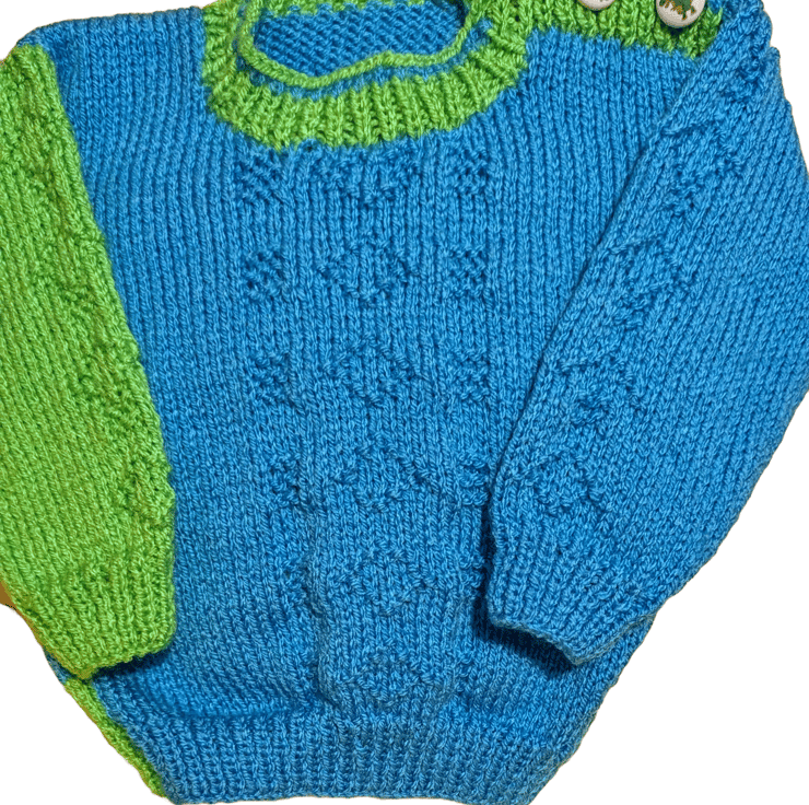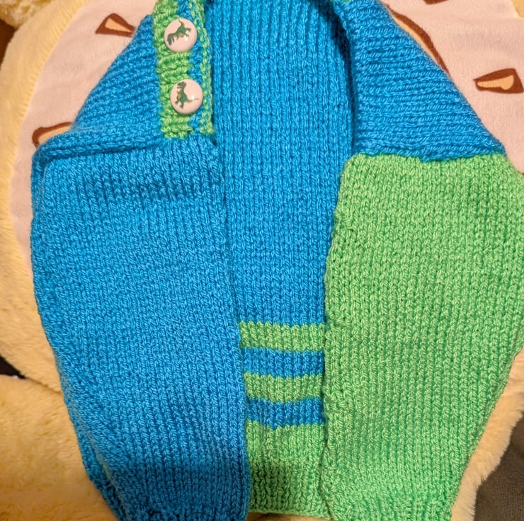 Unisex jumper to fit a 3 to 6th month old, it has a dainty pattern on front and sleeves. Contrasting colours to make an unusual jumper with a 3 button closing on left shoulder. If you want something different for your beauty, then this is the thing for when the sun isn't shining or when it goes down in the evening.