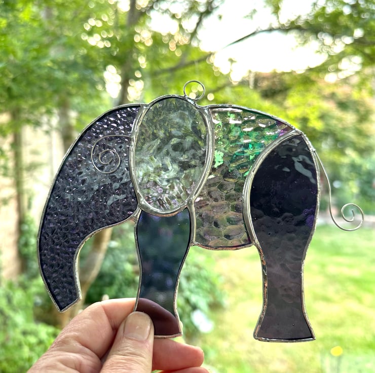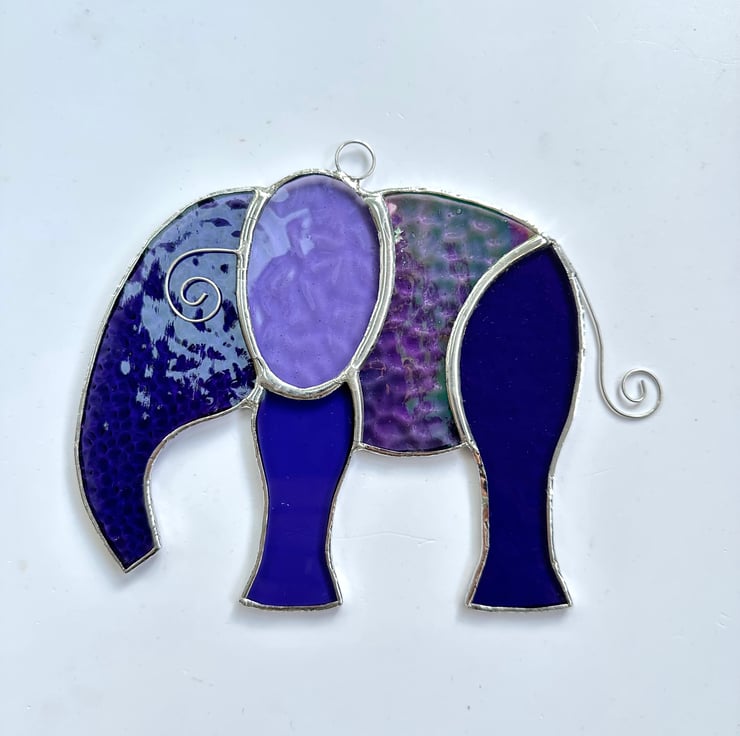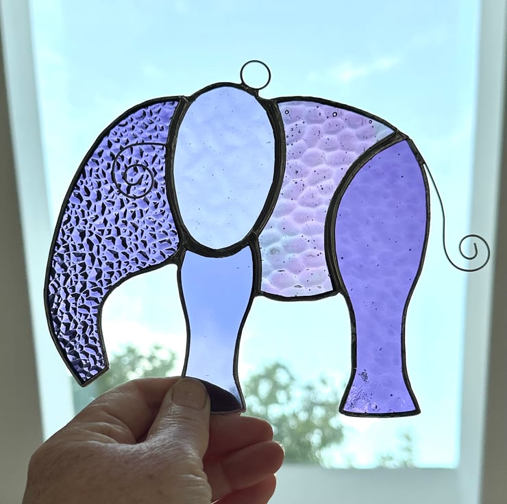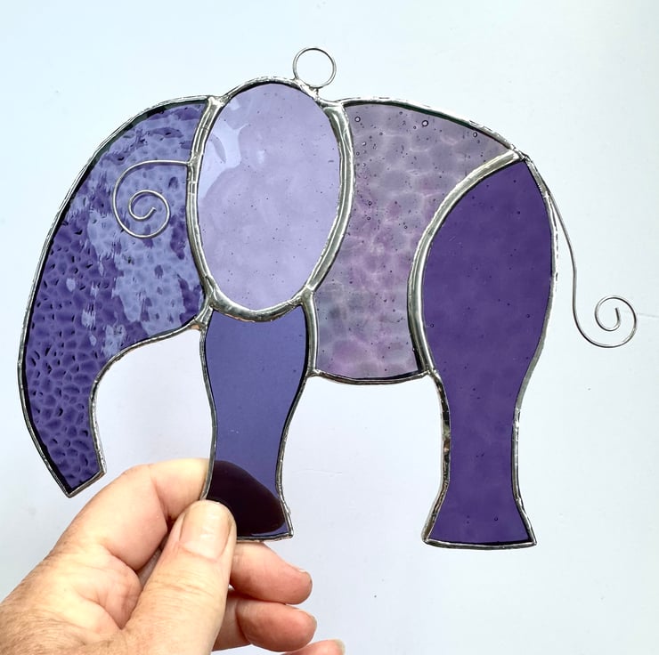 This elephant has been made using different types of purple and mauve stained glass including an iridescent glass. There are some lovely textures included.