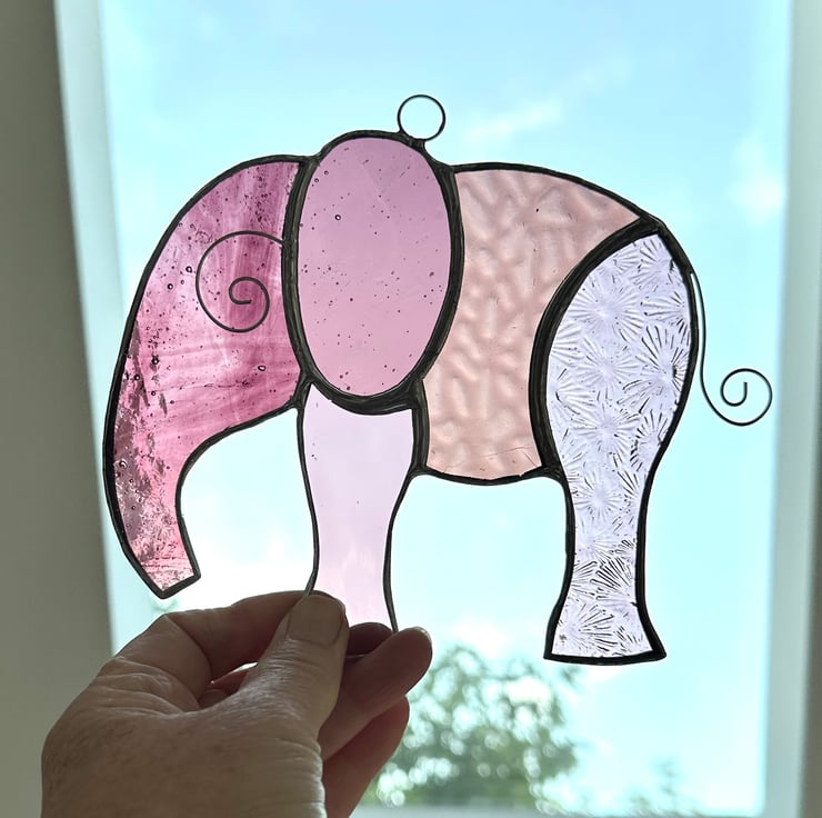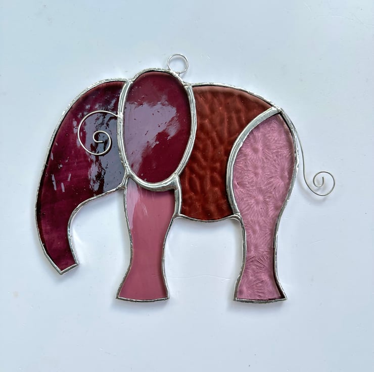 This elephant has been made using different 5 types of pink and mauve stained glass. There are some lovely textures included.