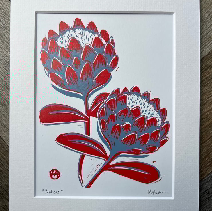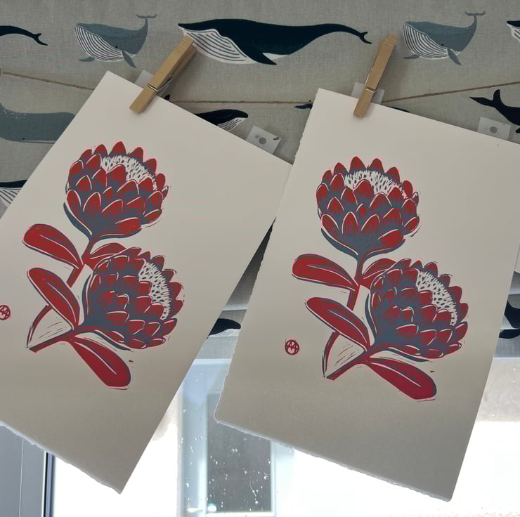 Original handmade two block lino print of two protea flowers - the national flower of South Africa - in vibrant colours of rich red and powder blue.