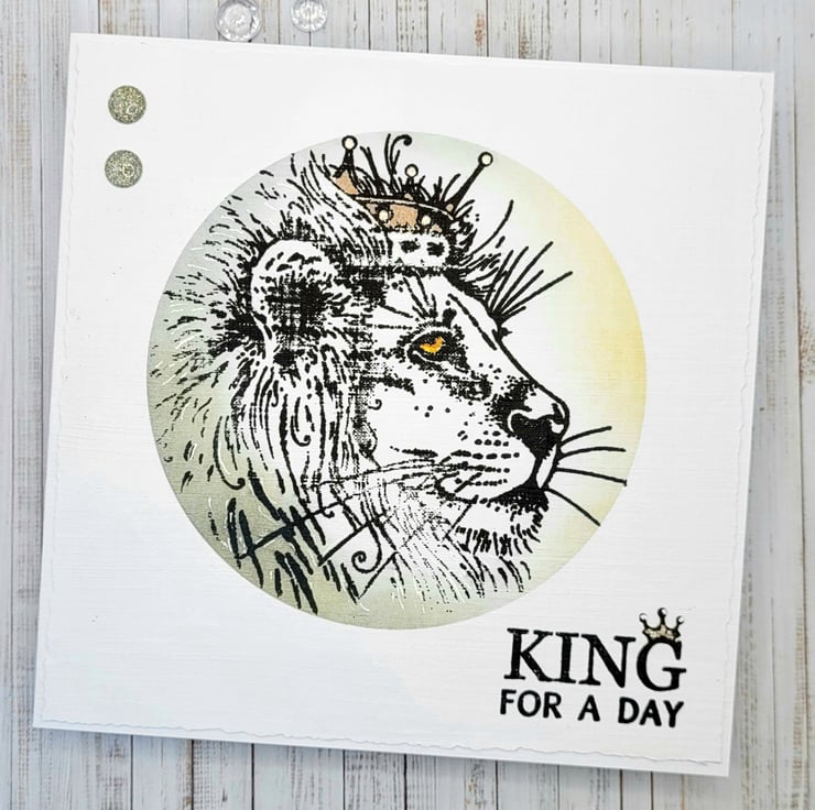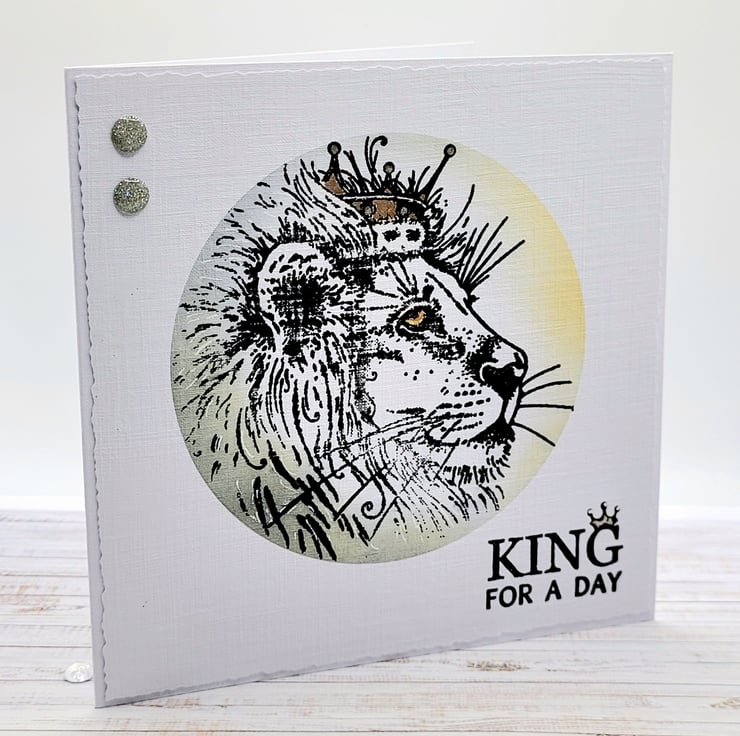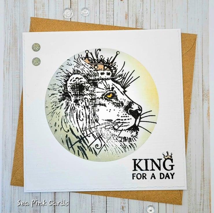 A lion greeting card that is blank inside for a personal message. Perfect for a birthday greeting or for father's day. The design features a fabulous majestic lion wearing a crown and the sentiment reads 'king for a day'! Measuring 14.5 x 14.5 cms the textured greetings card comes with a 100% recycled brown kraft paper envelope.