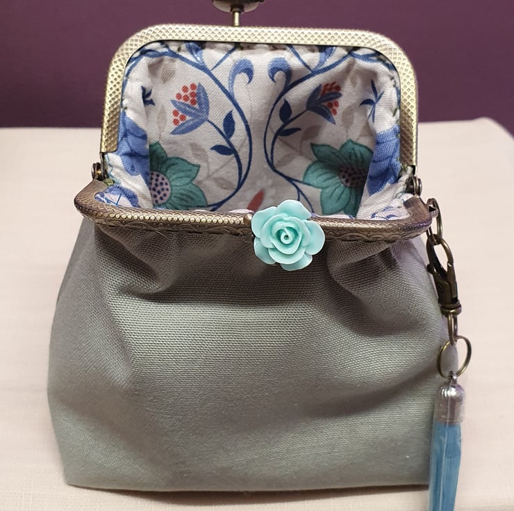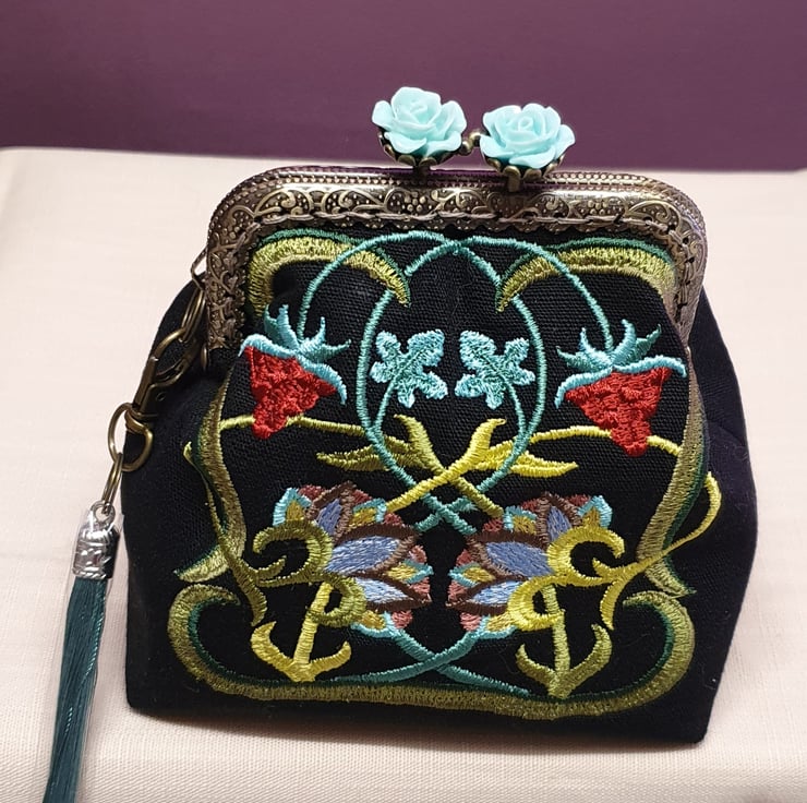 The purse has a kiss lock frame with a beautiful rose clasp.